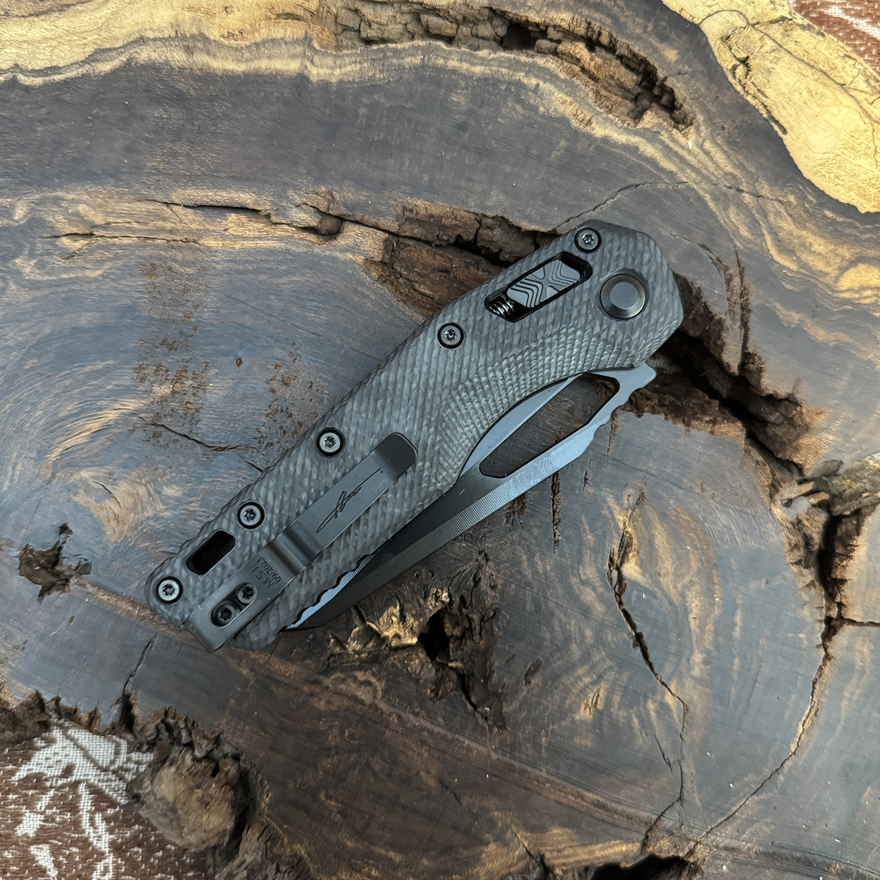 This model has a fluted carbon fiber handle, a DLC finished M390MK single edge blade with standard edge, and DLC finished hardware and reversible pocket clip. Brand new in box.