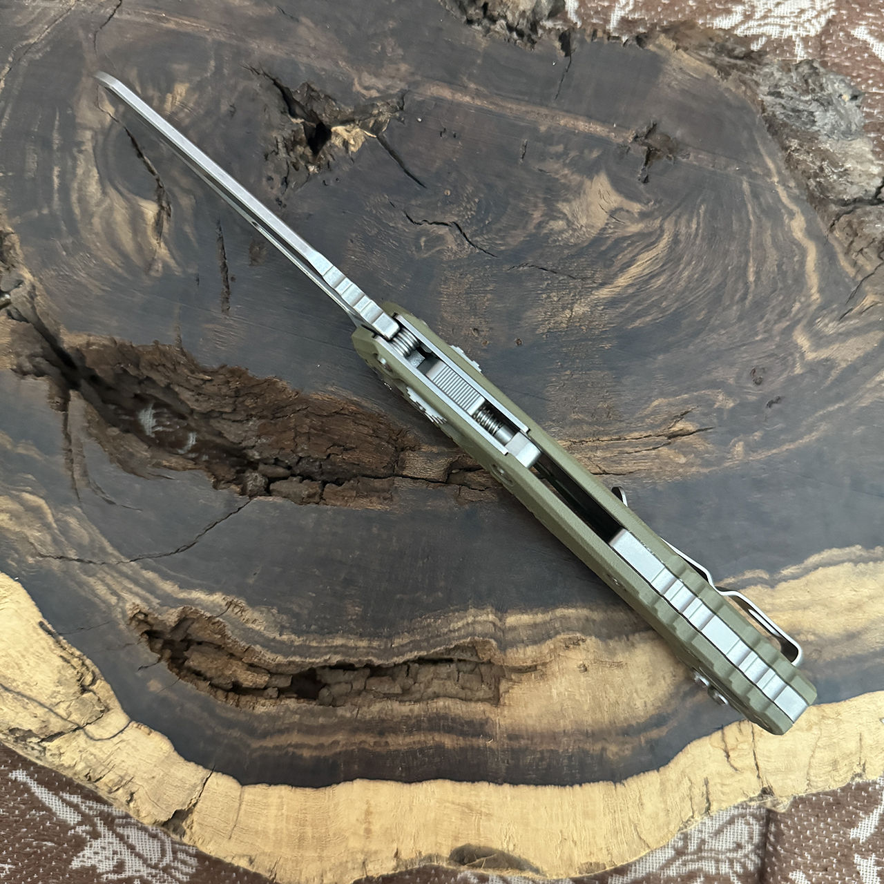This model has a tri-grip polymer OD Green handle. Stonewash finished M390MK single edge partially serrated edge blade. Brand new in box.