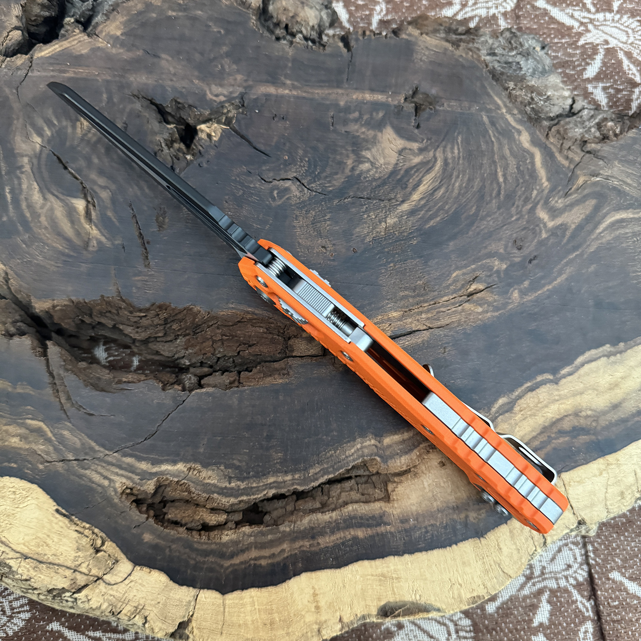 This model has a orange tri-grip texture polymer handle. Black finished M390MK single edge blade. Bead-Blast finished hardware and reversible pocket clip. Brand new in box.