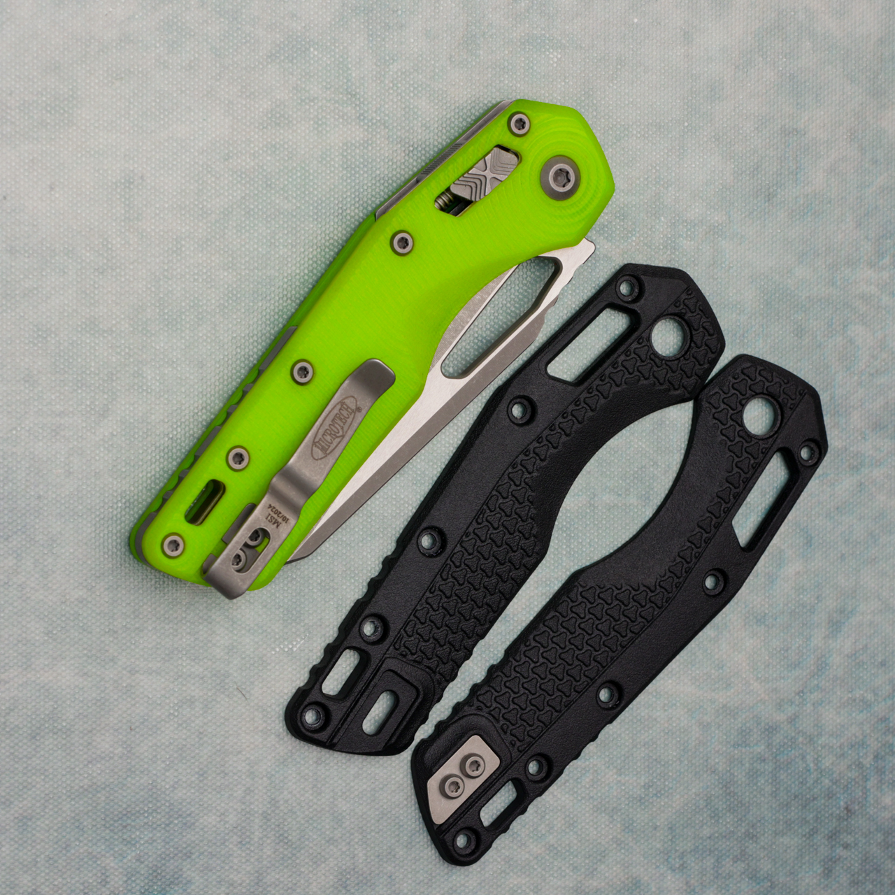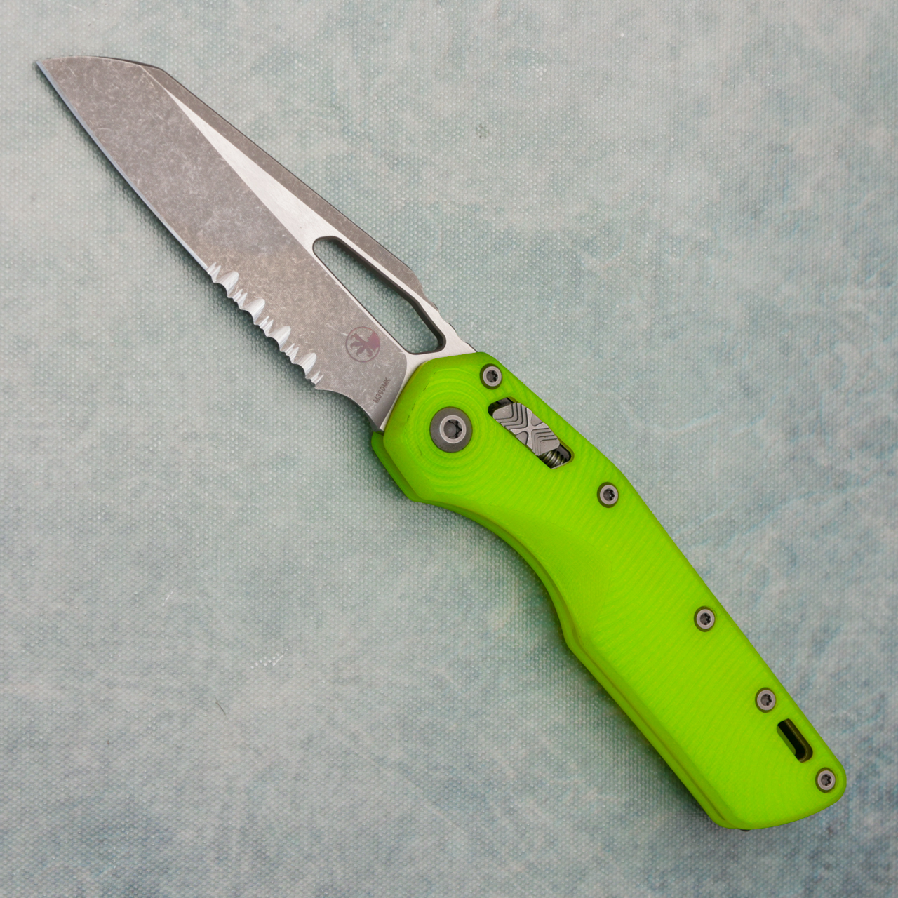 This model has RGT day glow G10 textured handle scales. Apocalyptic finished M390MK single edge partially serrated edge blade. Also comes with original black scales, very good condition in box.