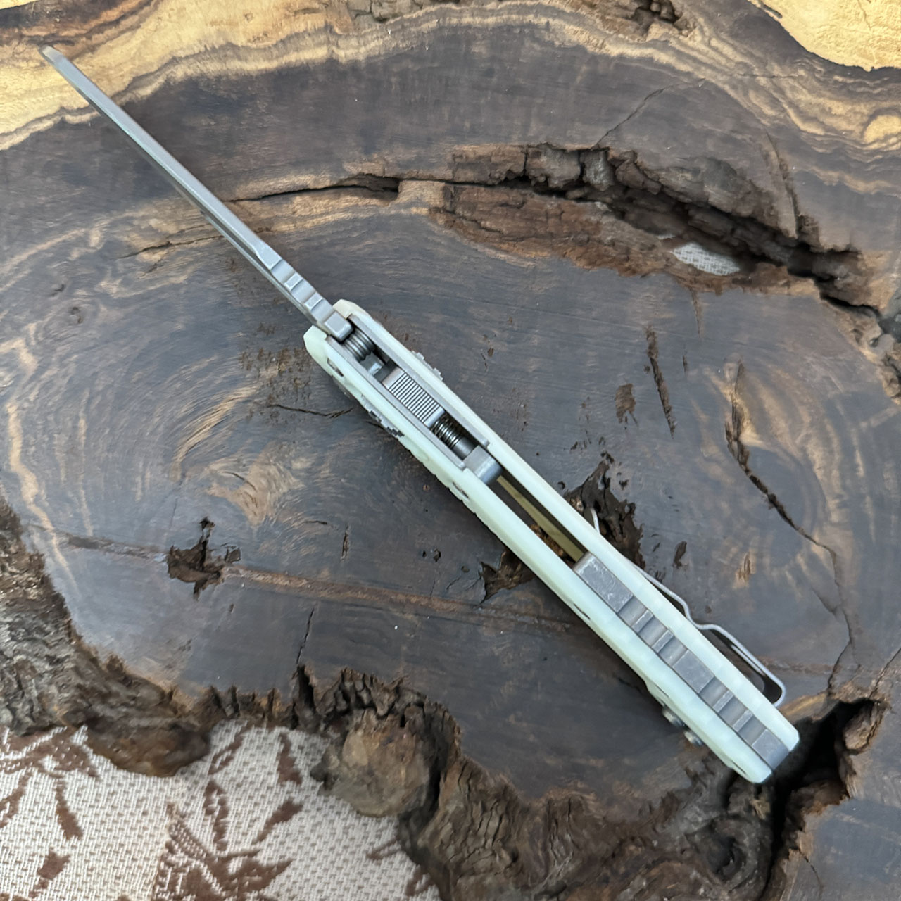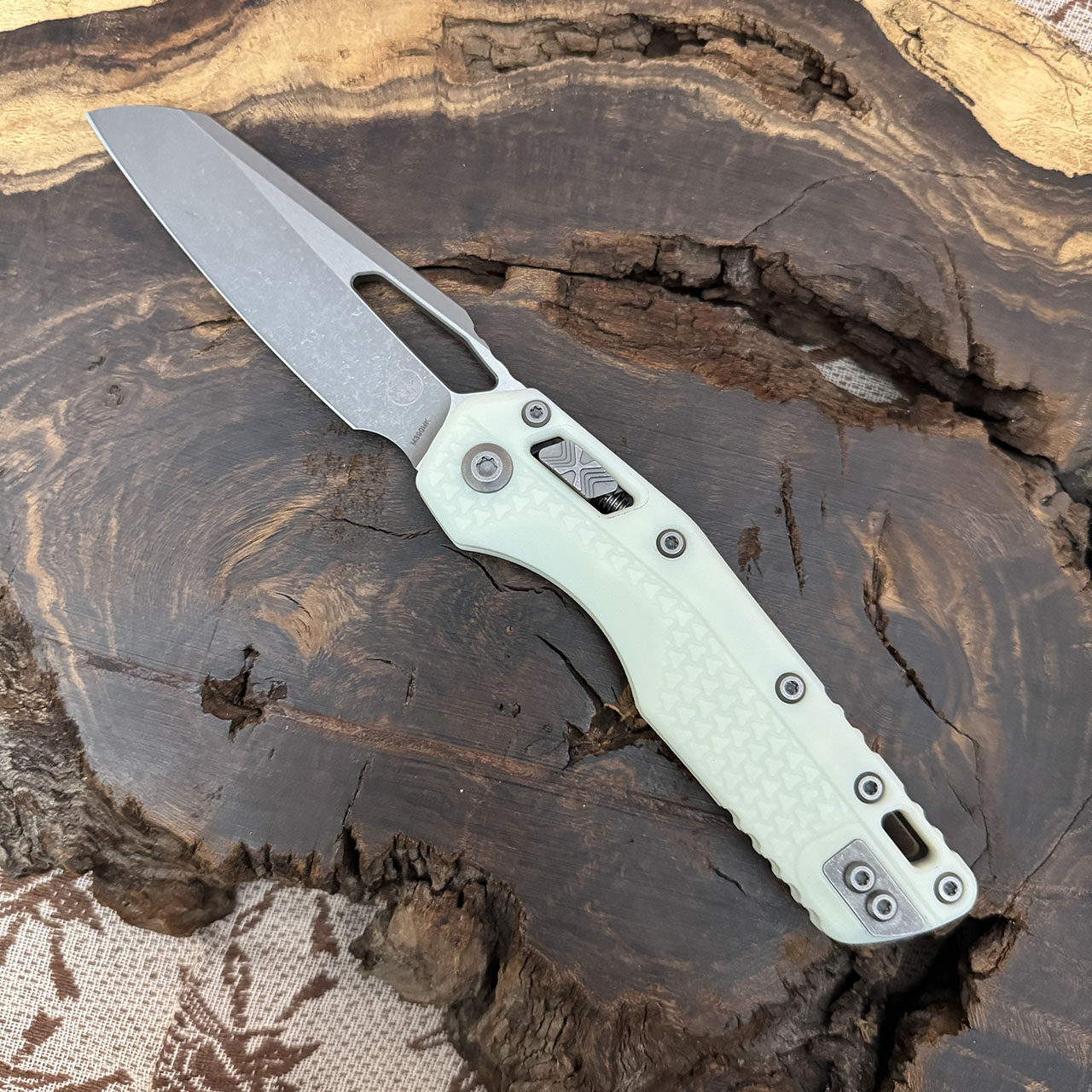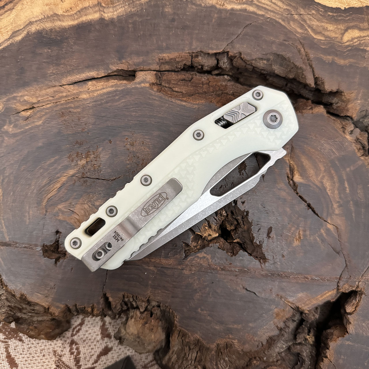 This model has a white tri-grip texture polymer handle. Apocalyptic finished M390MK single edge blade. Apocalyptic finished hardware and reversible pocket clip. Brand new in box.