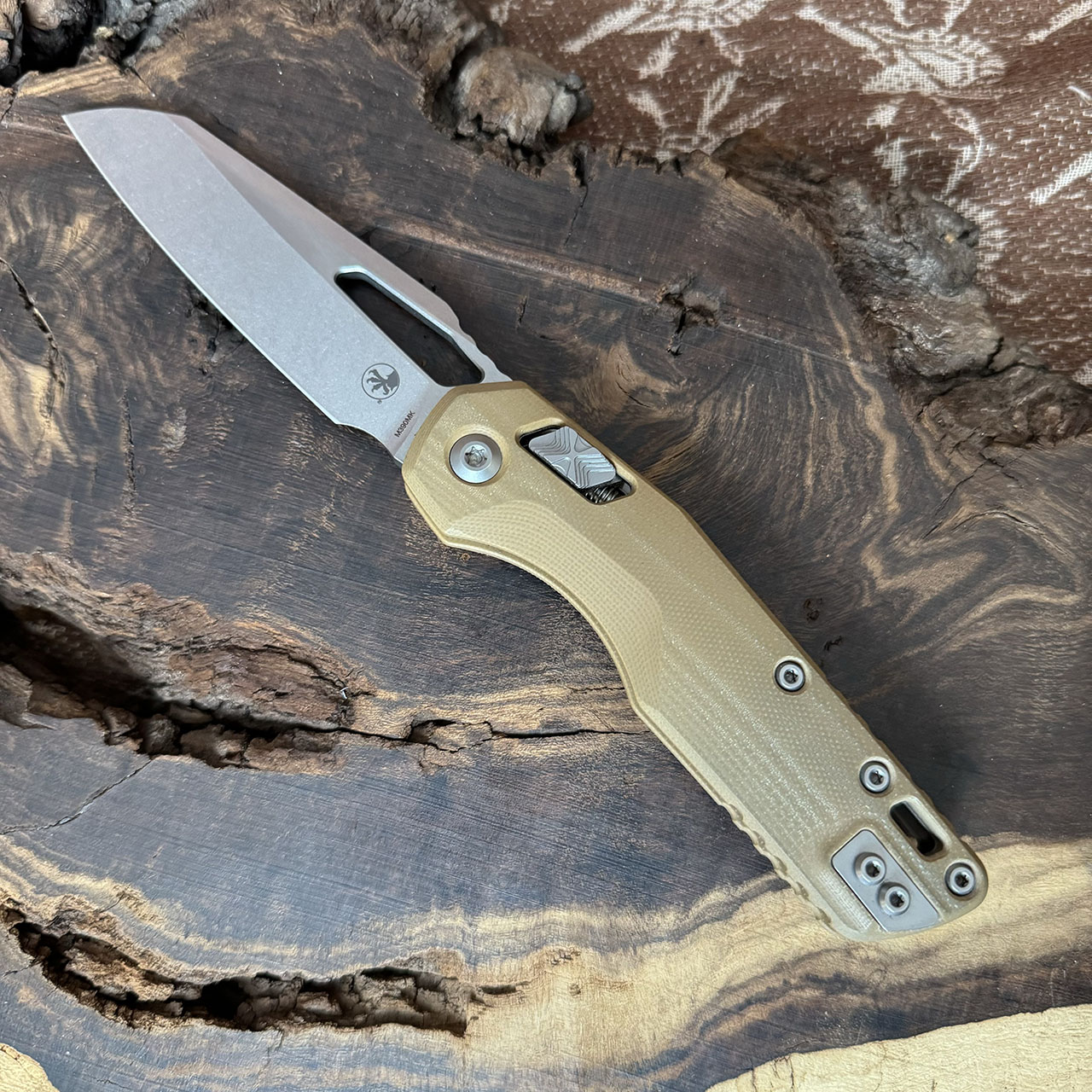 This model has a tan G-10 Handle. Stonewashed finished M390MK single edge blade. The tan G10 handle contains hardened steel liner plates, which gives the knife its rigidity. Complete with a titanium backspacer and reversible pocket clip for left-hand carry. Brand new in box.