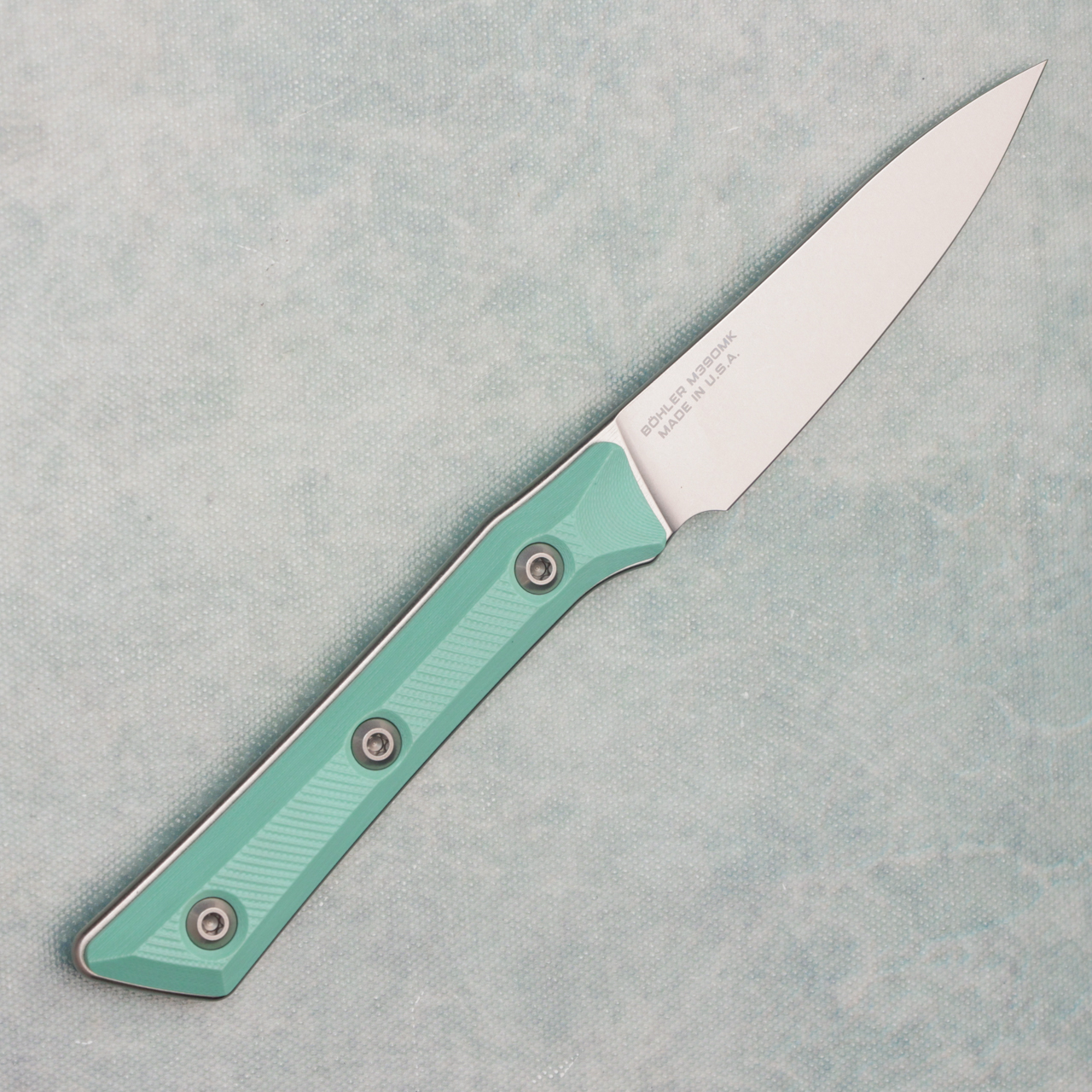 This model has Caribbean blue g-10 handle scales. Stonewash finished M390MK stainless steel blade. Brand new in box.