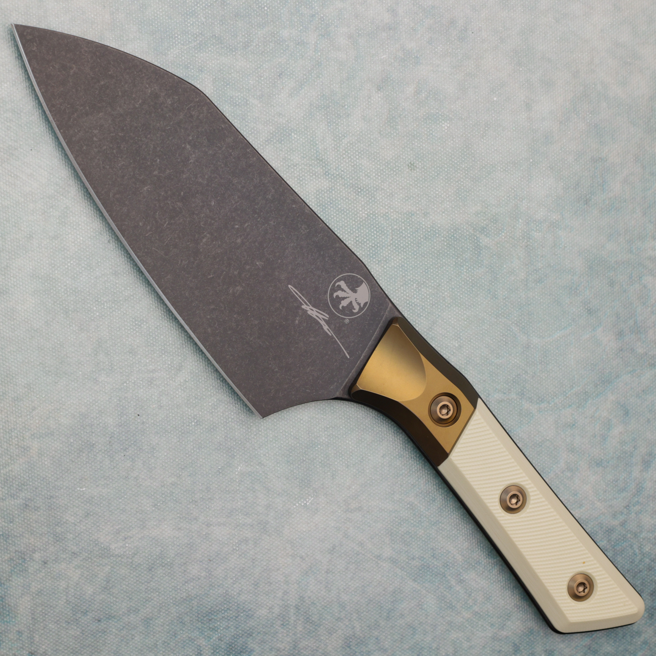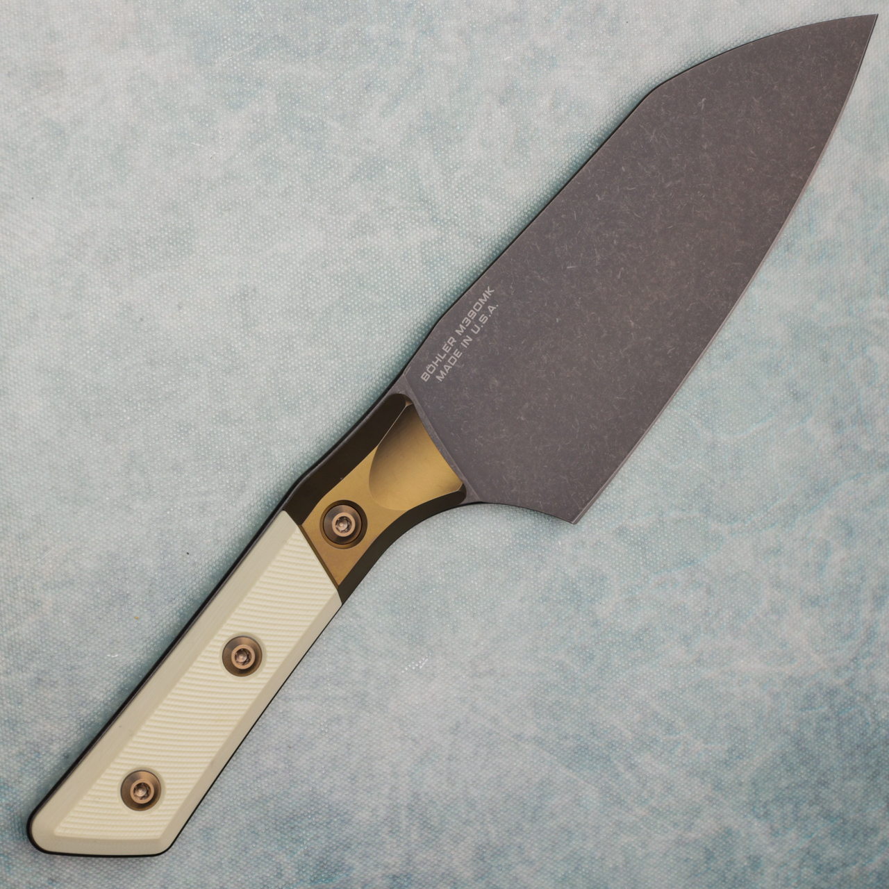 This model has ivory g-10 handle scales with bronzed titanium bolster. DLC finished M390MK stainless steel blade. Brand new in box.