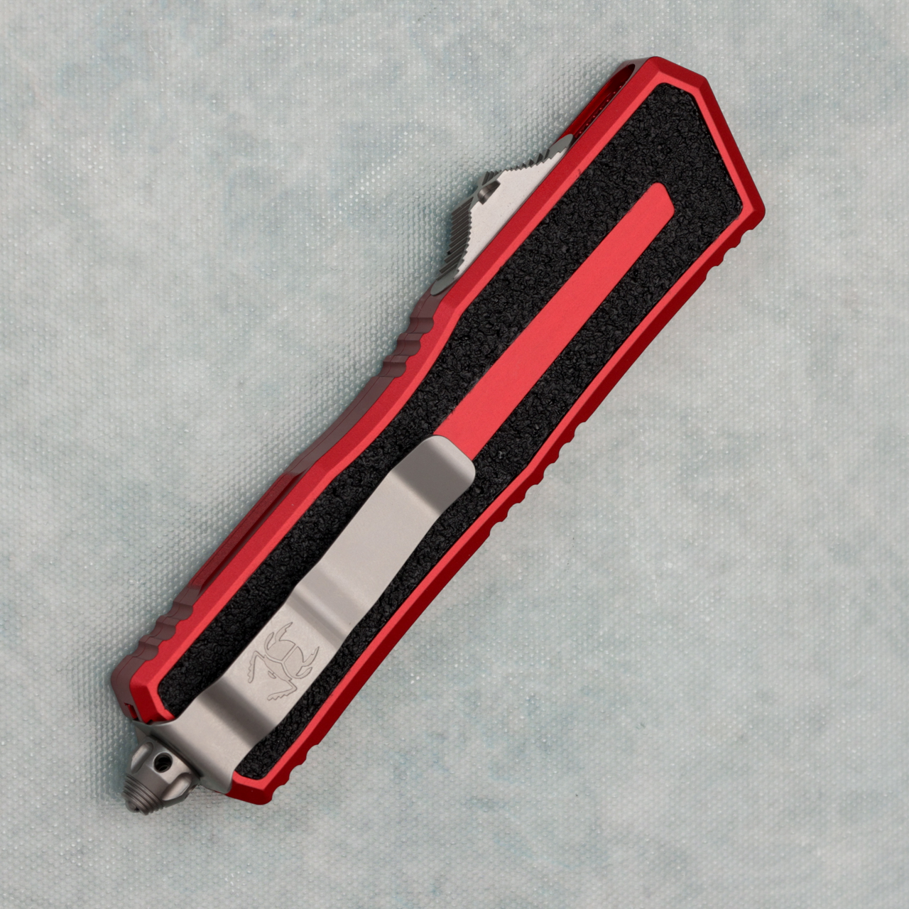 This model features red anodized 6061-T6 aluminum handle scales with 3M grip inlays. Stonewash finished M390MK stainless steel double edge blade. Stonewash finished hardware, pocket clip, and glass breaker tip. Brand new in box.