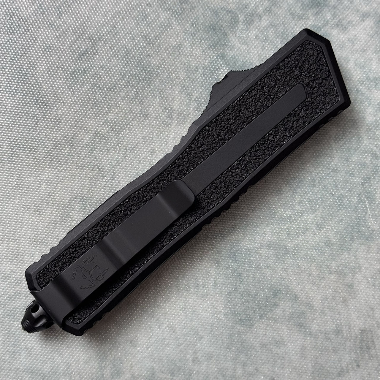 This model features black tactical anodized 6061-T6 aluminum handle scales with 3M grip inlays. Black finished M390MK stainless steel double edge blade. Black finished hardware, pocket clip, and glass breaker tip. Brand new in box.