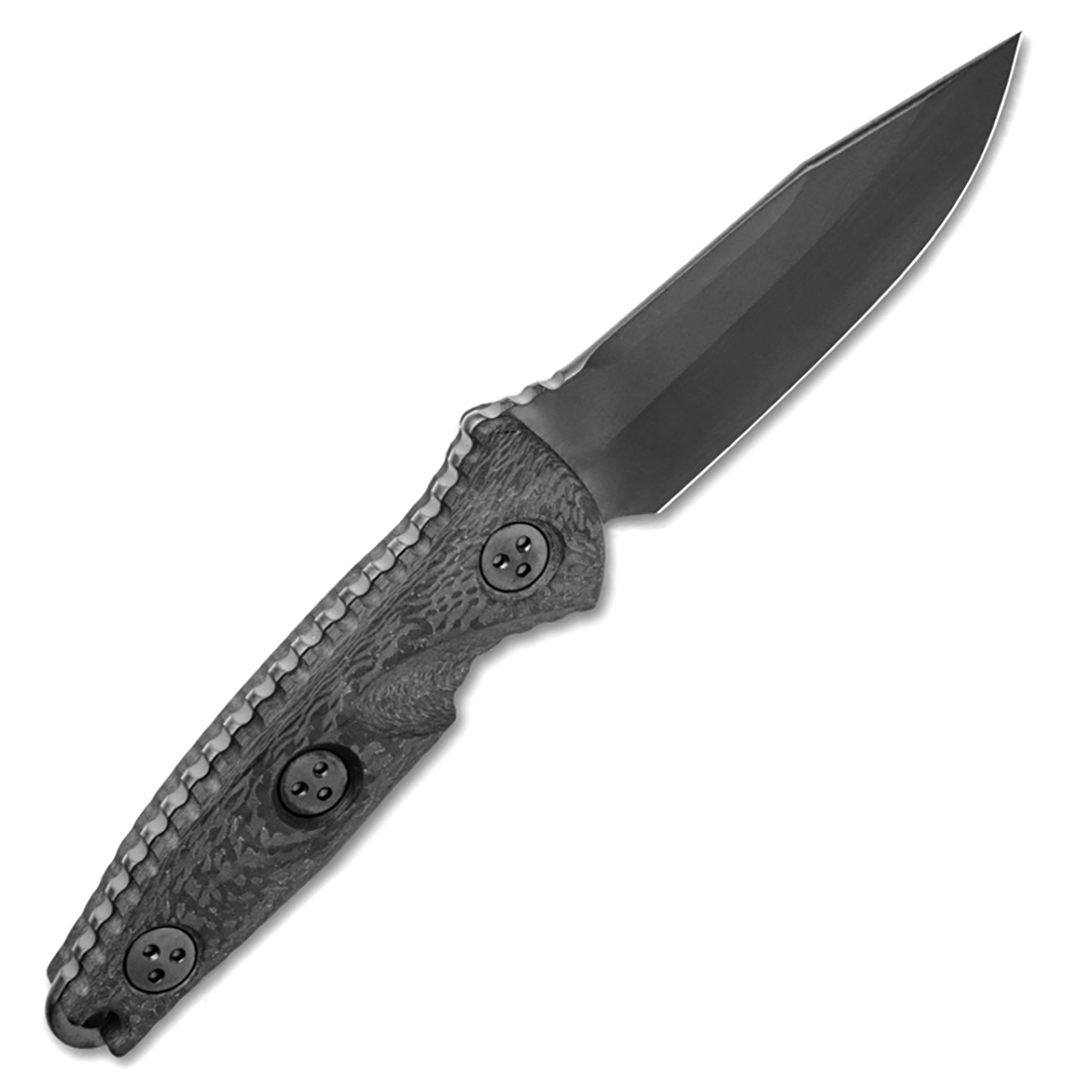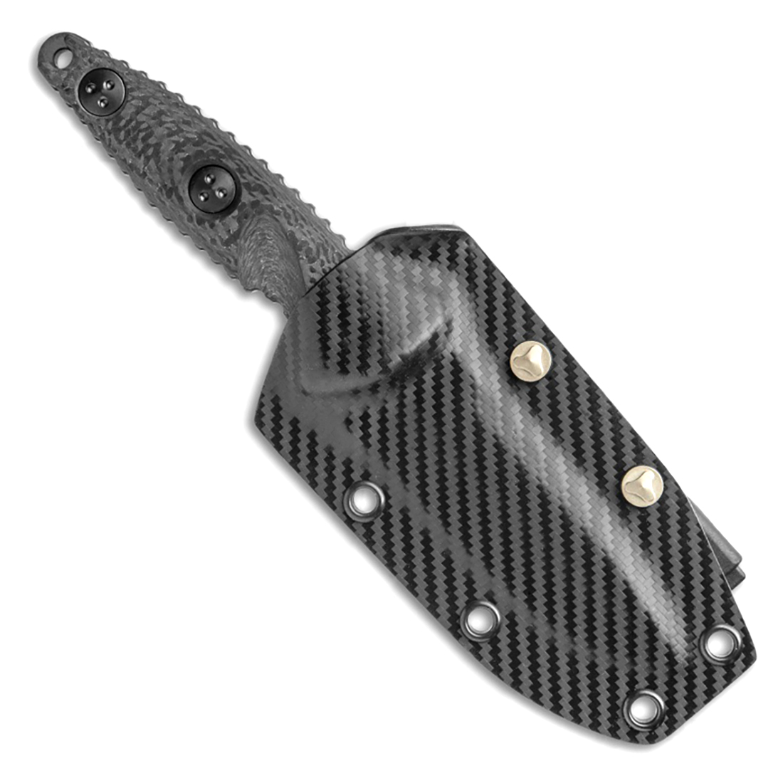 Another fantastic knife from Microtech! The Socom alpha mini is a tough knife in a perfectly sized package. Included carbon fiber stylized kydex sheath provides a sure grip on the knife. You can rest easy knowing whatever activity you’re doing, your knife will be at your side. The overall finish of the knife is perfect, m390 blade steel may prove a little more time consuming during sharpening (a good sharpening system is a great idea for these knives, Microtech will also sharpen them for a nominal shipping fee), it makes up for it by how long it will hold a useable edge. I would recommend this knife to anybody looking for a quality fixed blade built to last a lifetime or two.