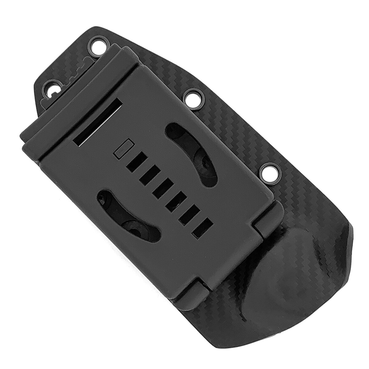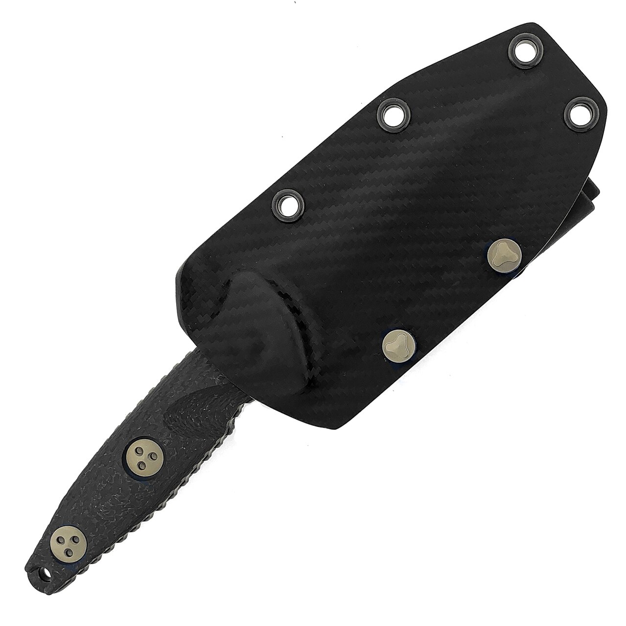 The Signature Series model features carbon fiber handle scales. Black stonewash DLC finished ELMAX stainless steel clip point blade. Bronze finished hardware. The blade has the model information, serial number, production date, and the Signature Series logo. Includes a carbon fiber wrapped Kydex sheath. Brand new in box.