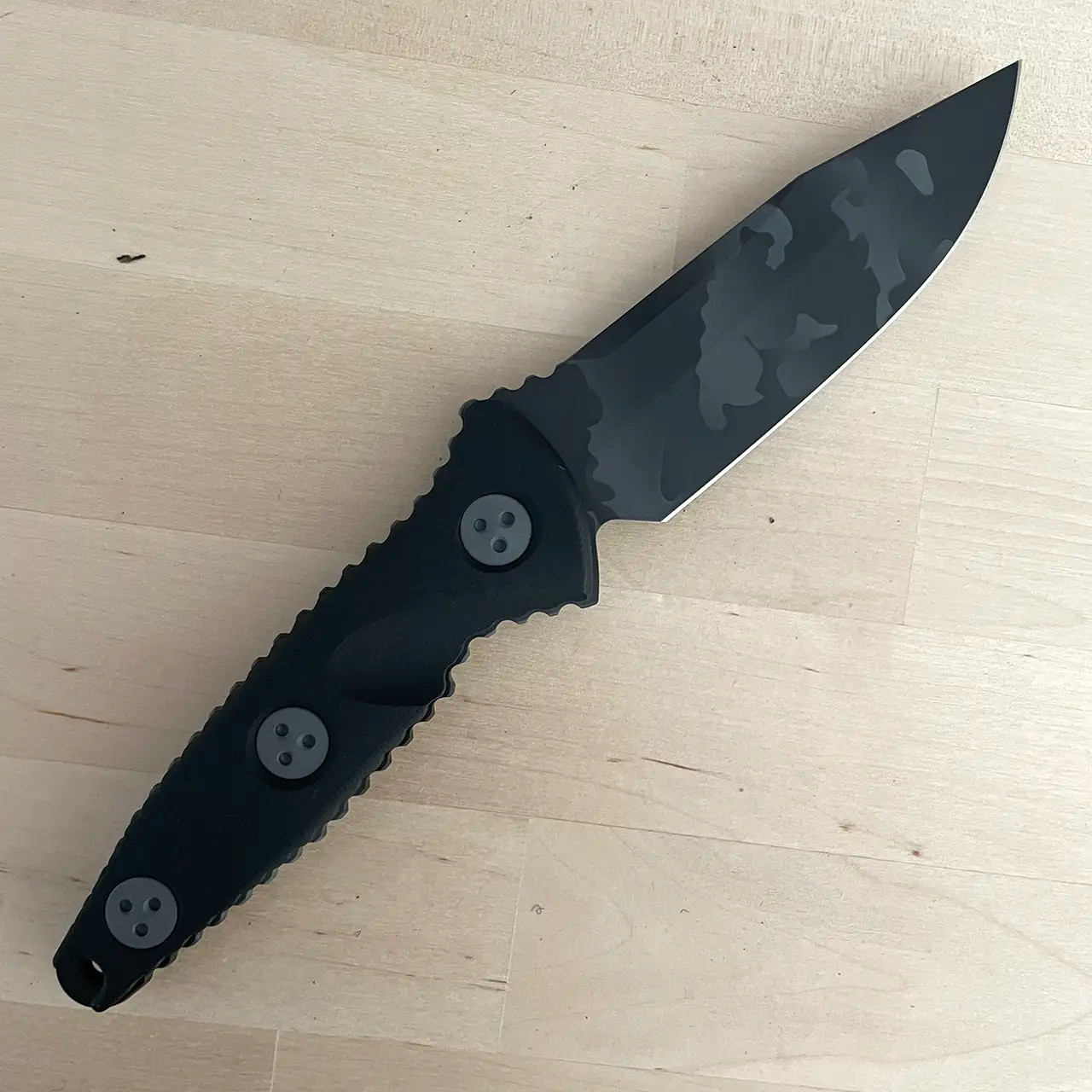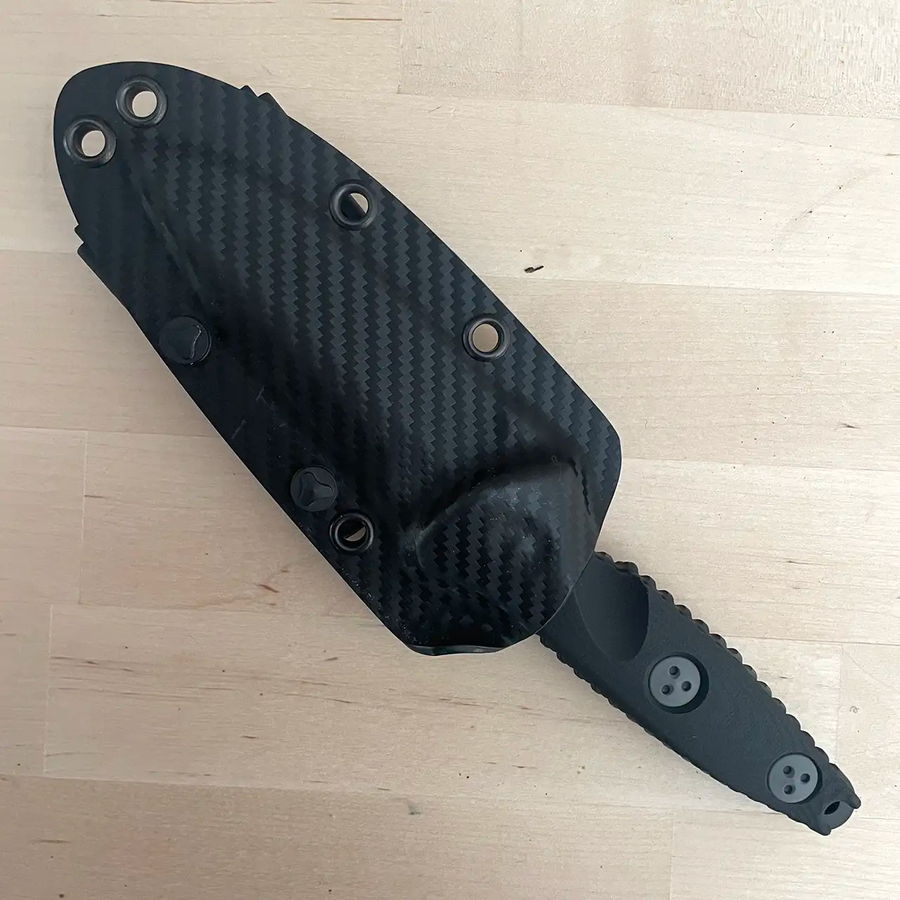 Adding to the popular Socom lineup, Microtech introduced the Socom Alpha mini styled after the Socom Elite folder. As the name suggests this is a scaled down version of the Socom Alpha. Raised full tang construction with jimping all the way around for enhanced grip. Contoured handle scales provide for a comfortable grip and are held secure by three large proprietary screws. A lanyard hole at the end doubles as a glass breaker. Each one includes a custom molle compatible Kydex sheath, making this knife an excellent choice for everyday carry.