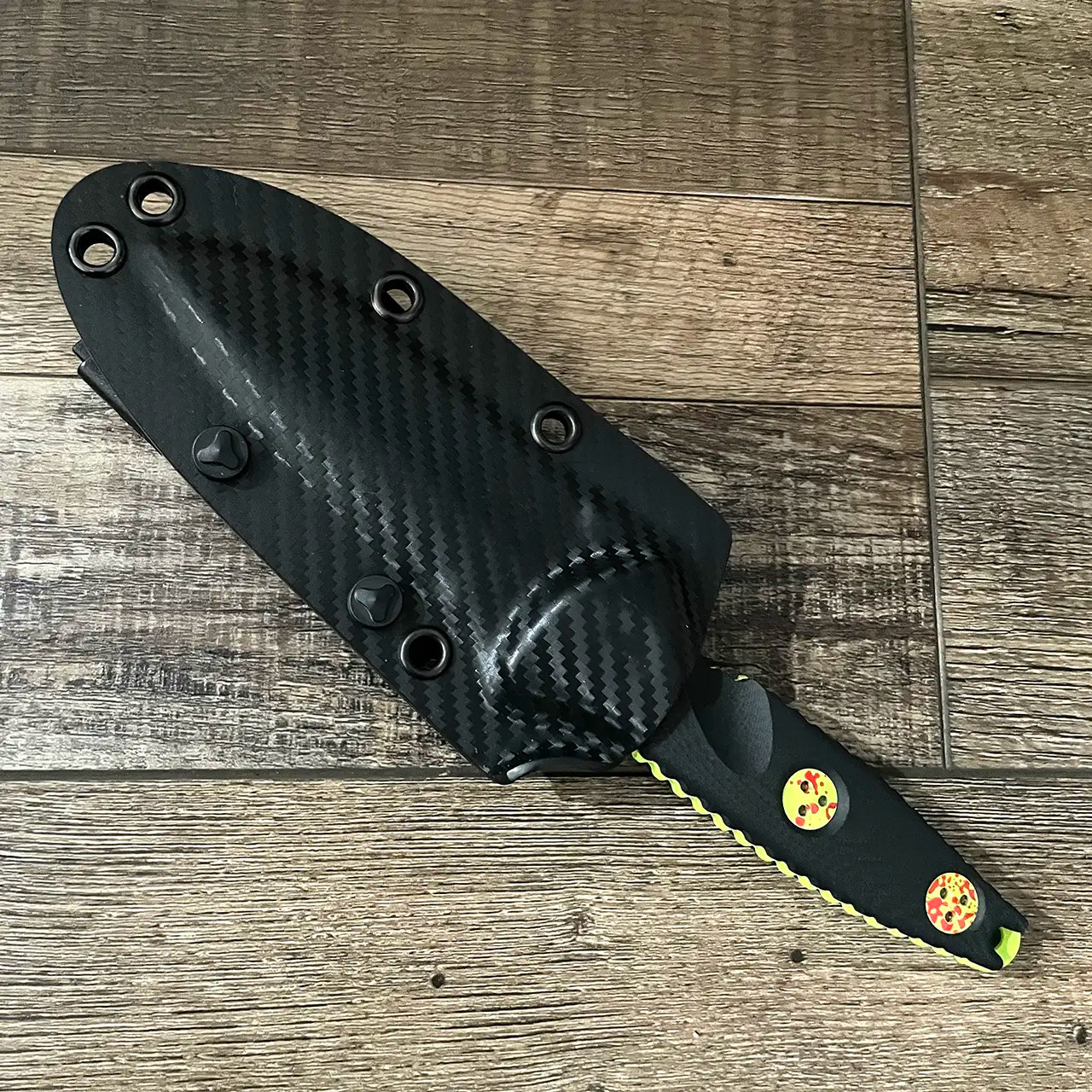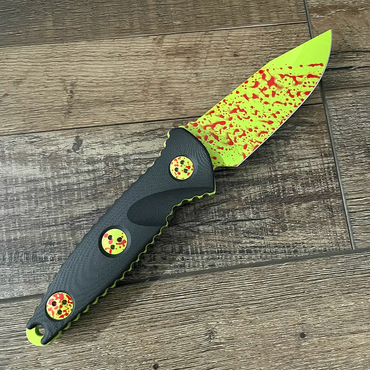 This model features black anodized 6061-T6 contoured aluminum handle scales with zombie green with random red "blood" spatter hardware. Zombie green with random red splatter finished M390 stainless steel single edge blade. The Zombie models are sterile with no markings other than the Zombie Tech on the front of the blade. Brand new in box with kydex sheath.