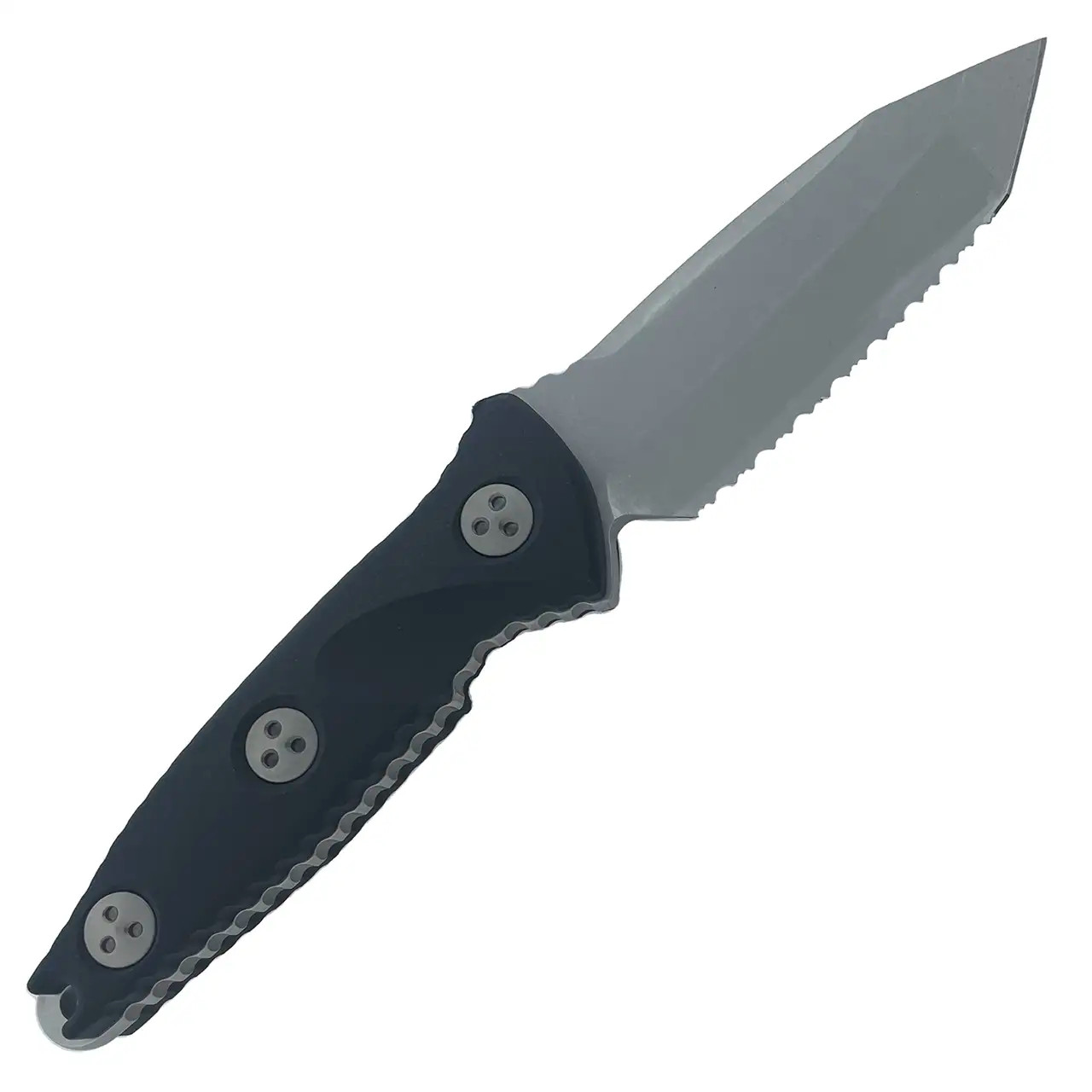 This model features black G-10 handle scales. Stonewash finished M390 stainless steel tanto point blade with a fully serrated edge. Bead blast finished hardware. The blade has the model information, serial number, production date, and the Microtech logo. Includes a carbon fiber wrapped Kydex sheath. Brand new in box.
