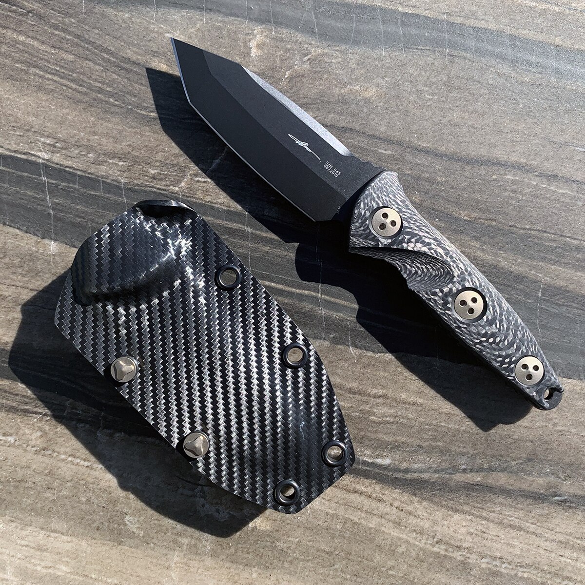 The Signature Series model features carbon fiber handle scales. Black stonewash DLC finished M390 stainless steel tanto blade. Bronze finished hardware. The blade has the model information, serial number, production date, and the Signature Series logo. Includes a carbon fiber wrapped Kydex sheath. Brand new in box.