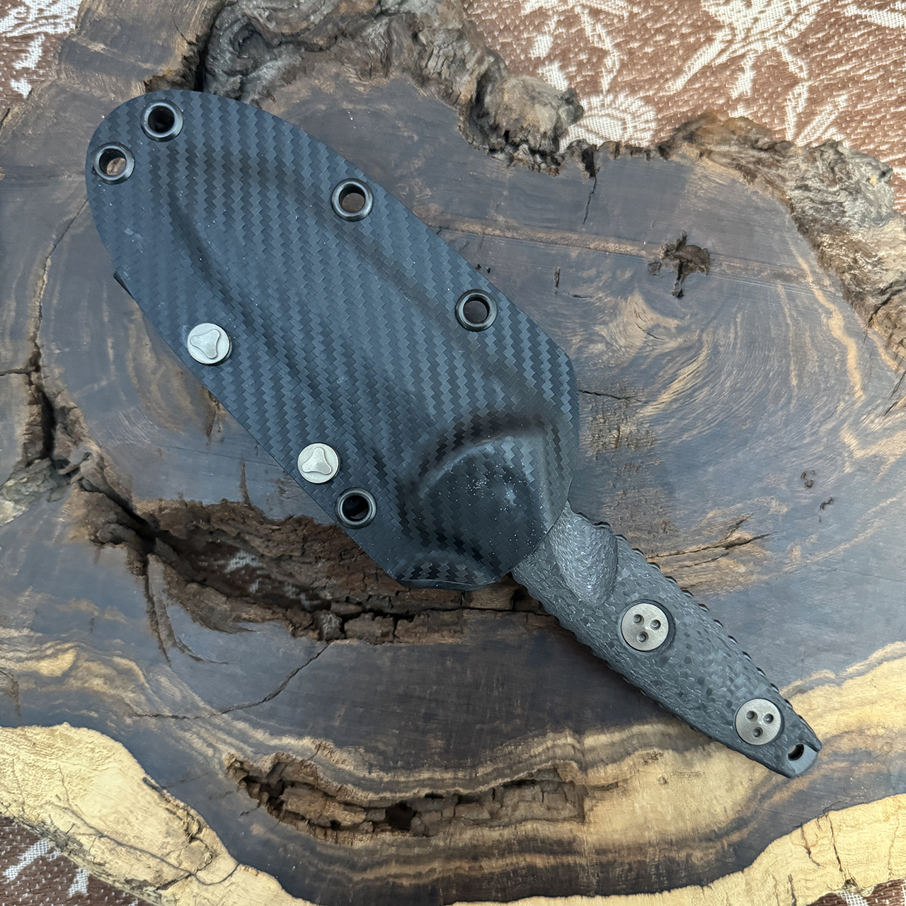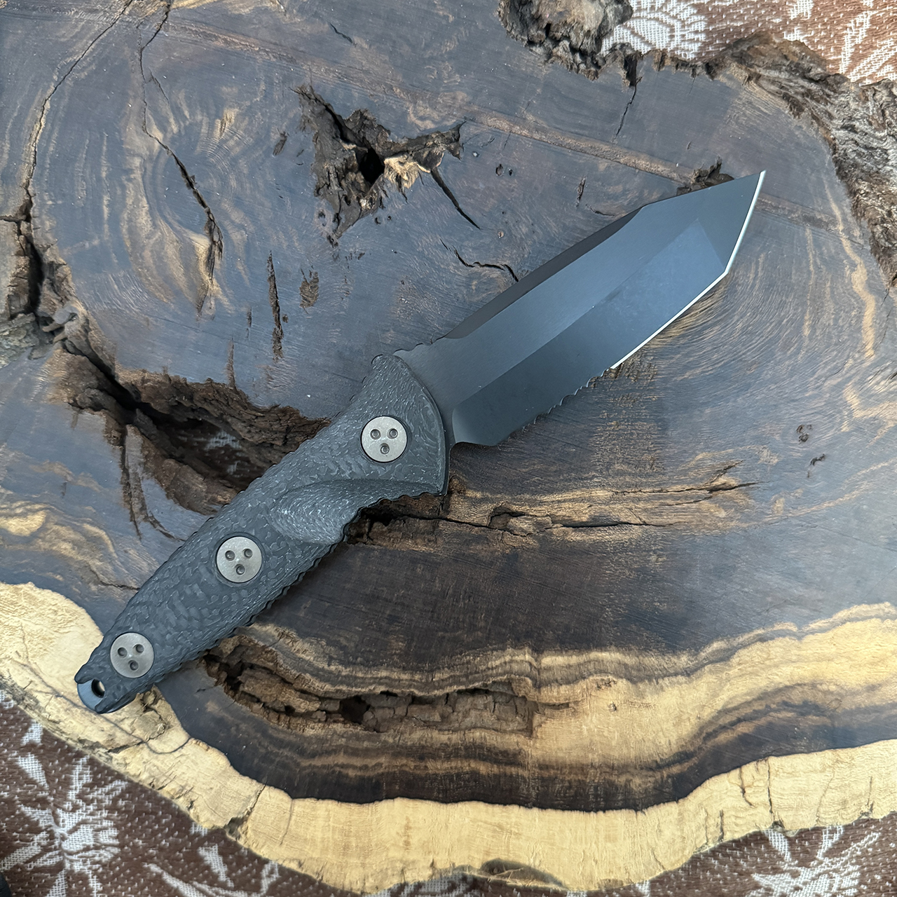 This limited edition Signature Series model features carbon fiber handle scales. Black stonewash DLC finished M390 stainless steel tanto point blade with a partially serrated edge. Black DLC finished hardware. The blade has the model information, serial number, production date, and the Signature Series logo. Includes a carbon fiber wrapped Kydex sheath. Brand new in box.