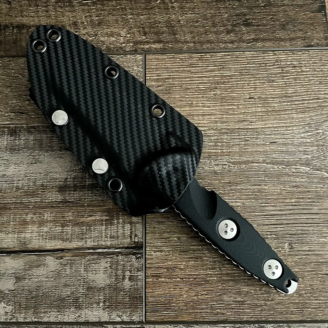 This model features black G-10 handle scales. Stonewash finished M390 stainless steel warcom blade. Bead Blast finished hardware. The blade has the model information, serial number, production date, and the Microtech logo. Includes a carbon fiber wrapped Kydex sheath. Brand new in box.