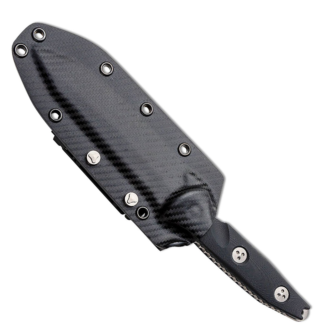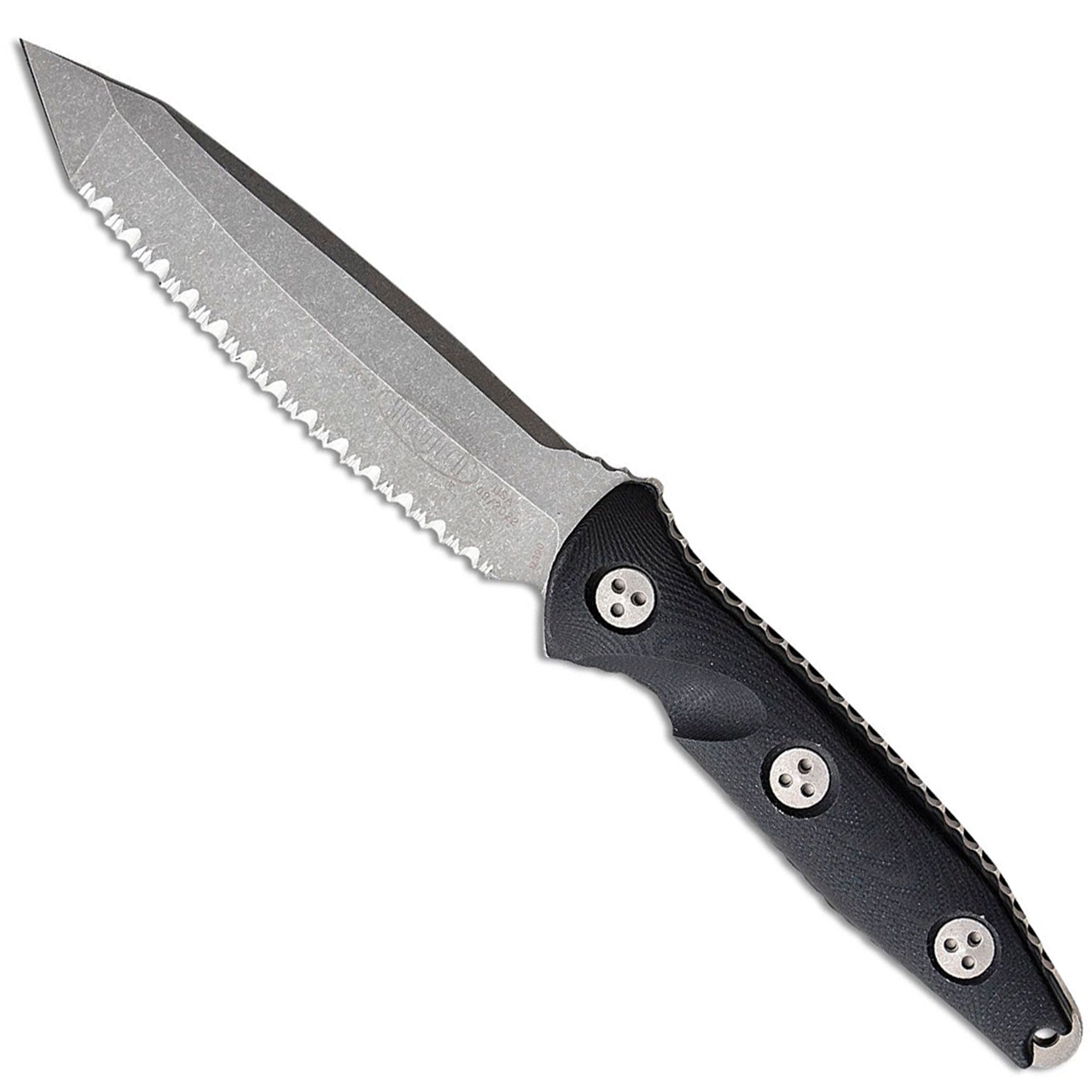 This model features black G10 handle scales. Apocalyptic finished M390 stainless steel fully serrated tanto edge blade. Apocalyptic finished hardware. The blade has the model information, serial number, production date, and the Microtech logo. Includes a carbon fiber finished Kydex sheath. Brand new in box.