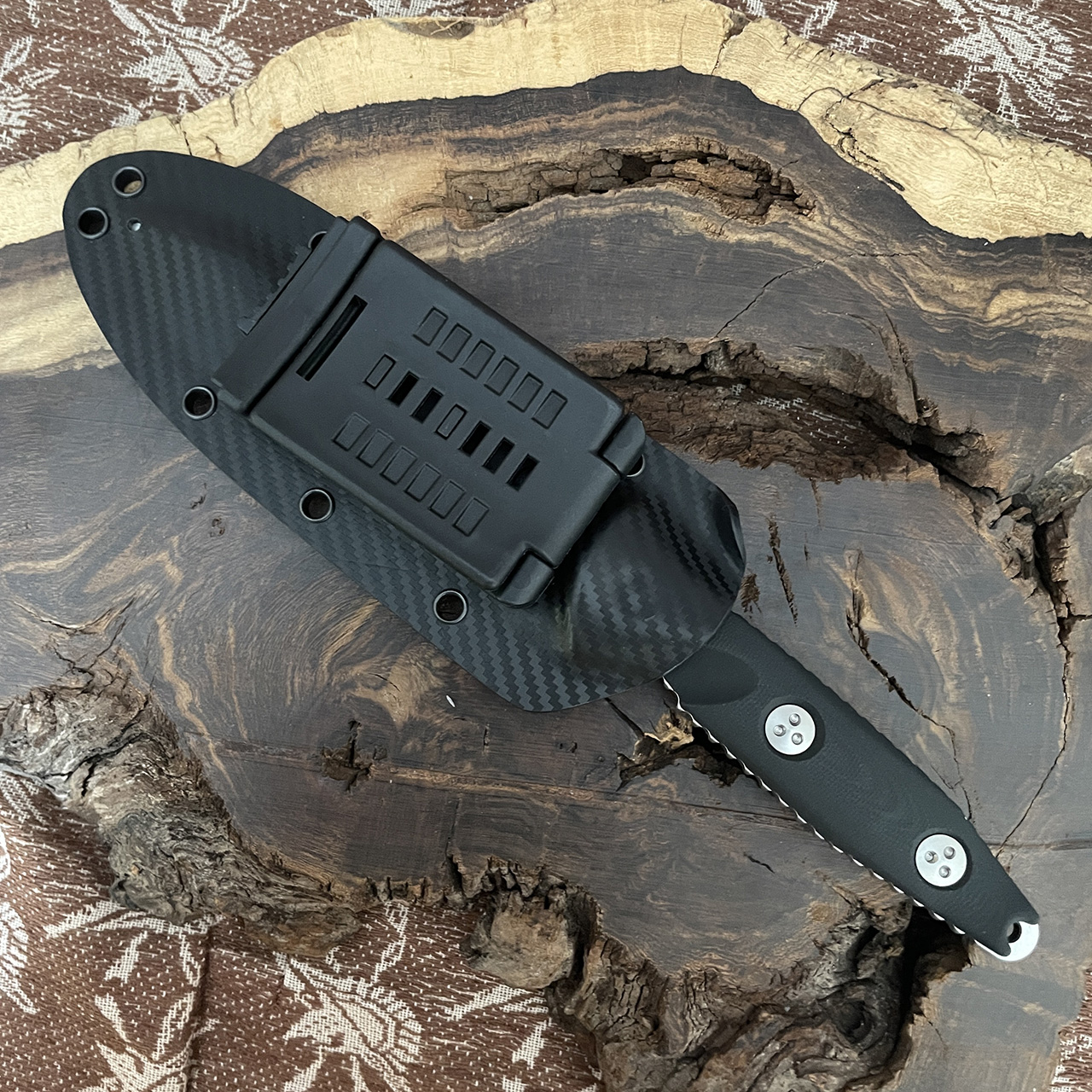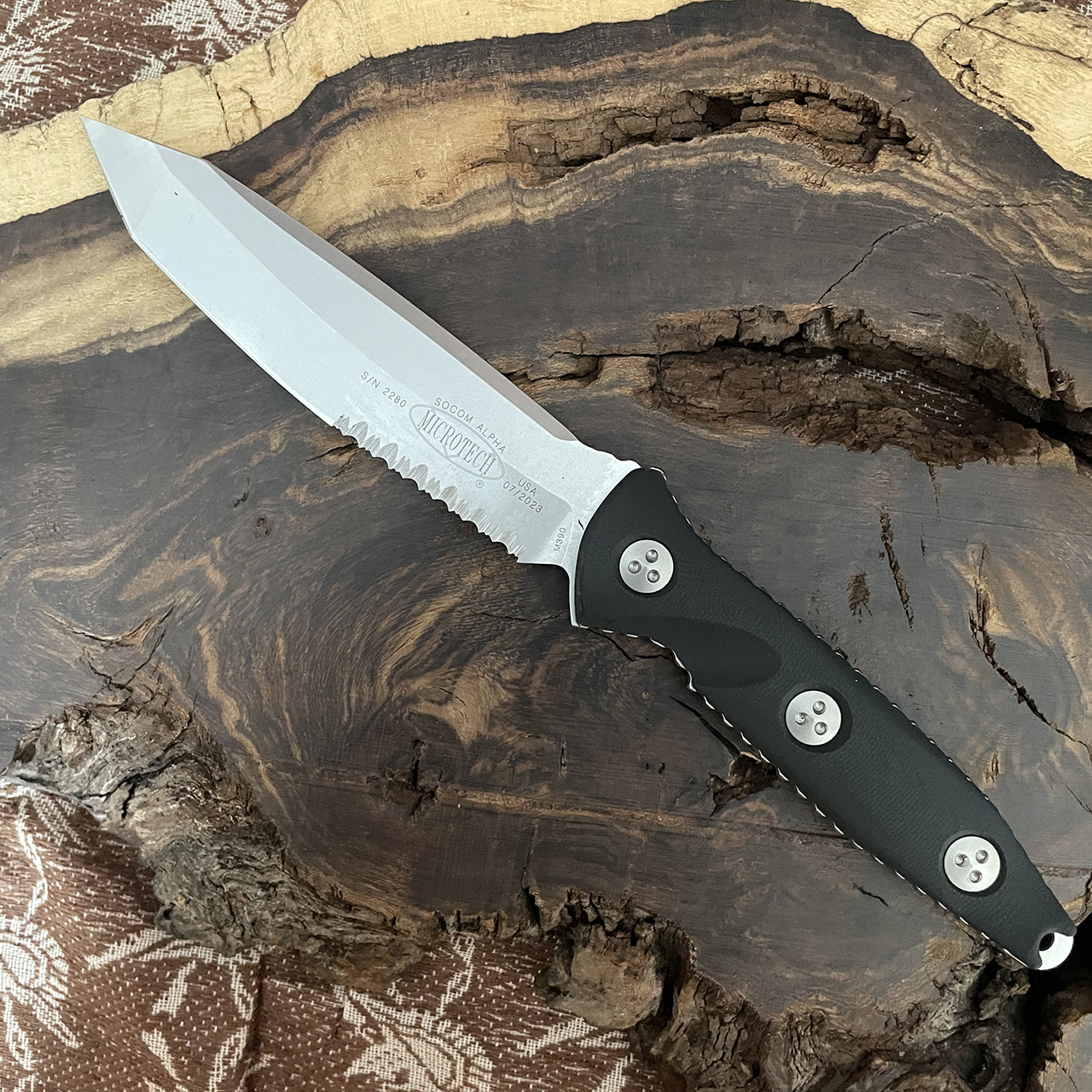 This model features black G10 handle scales. Stonewash finished M390 stainless steel paritally serrated tanto blade. Bead blast finished hardware. The blade has the model information, serial number, production date, and the Microtech logo. Includes a carbon fiber finished Kydex sheath. Brand new in box.