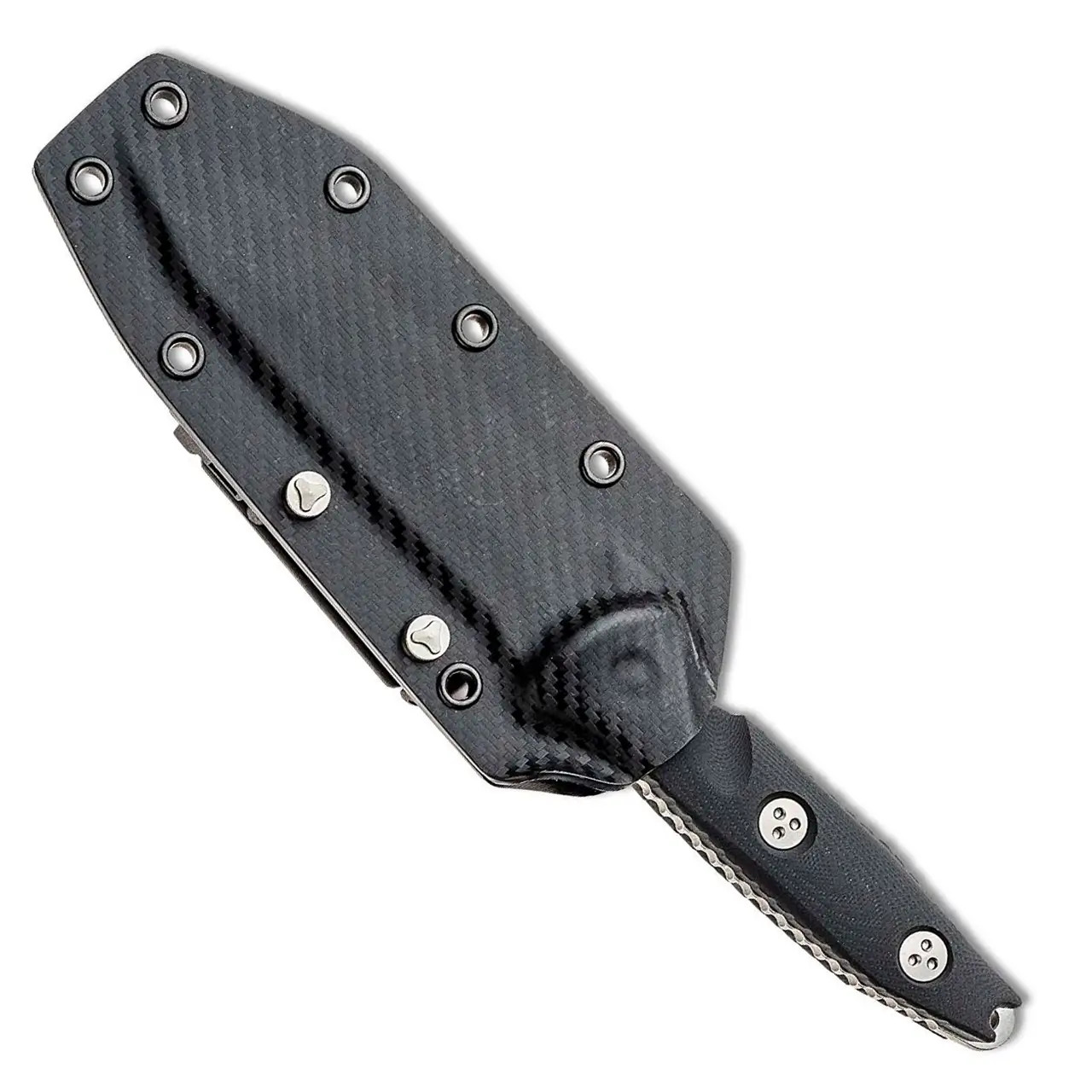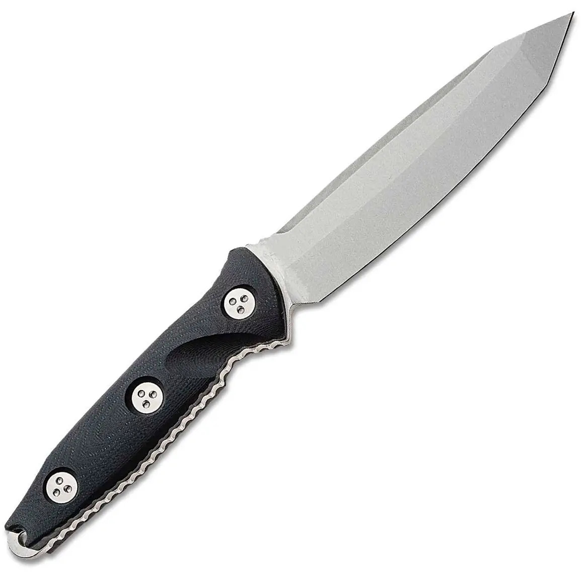 This model features black G10 handle scales. Stonewash finished M390 stainless steel tanto blade. Bead blast finished hardware. The blade has the model information, serial number, production date, and the Microtech logo. Includes a carbon fiber finished Kydex sheath. Brand new in box.