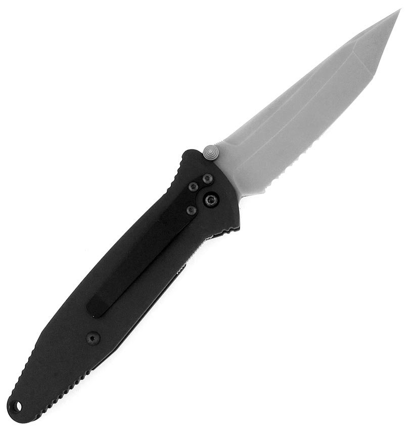 We are happy to offer this ever popular and hard to find original Socom D/A Auto. Black anodized 6061-T6 aircraft aluminum with kraton grip inserts. Two holes were drilled in the front handle scale presumably for a left handed pocket clip. Silver finished 154-CM stainless steel tanto blade with a partially serrated edge. Double action auto allows for automatic or manual opening. Black pocket clip for tip down carry and lanyard hole. Made in 05/1999 when Microtech was still in Florida. This knife was acquired through a collection and appears to be in new condition (other than the holes that were drilled). Comes with original Microtech sheath, no box.