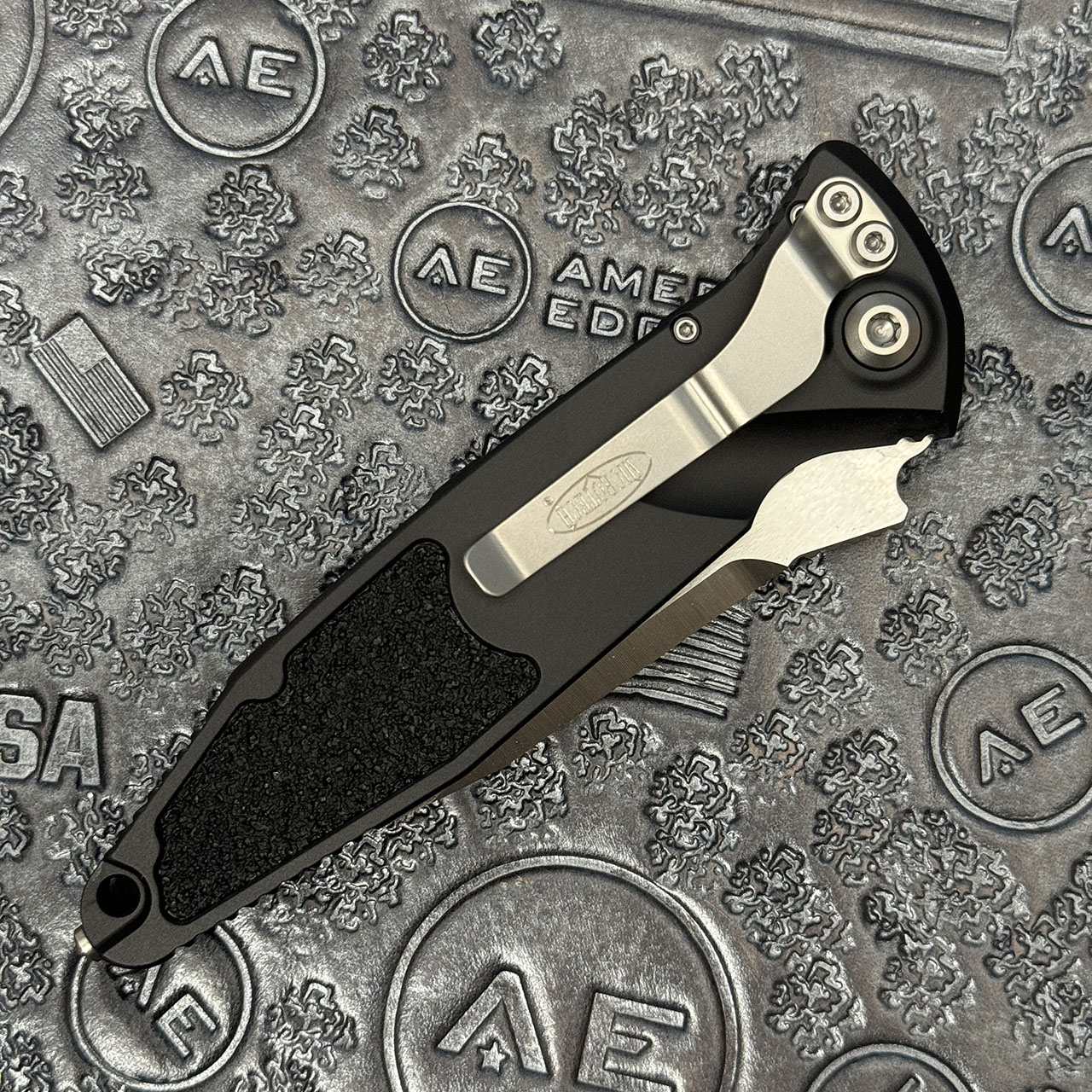 This model features a black anodized 7075-T611 aluminum handle with grip inserts. Satin finished M390 stainless steel single edge clip point blade with partial serrations. The pocket clip is marked with the Microtech logo. The blade is marked with the Microtech logo, model information, production date, and serial number. Brand new in box.