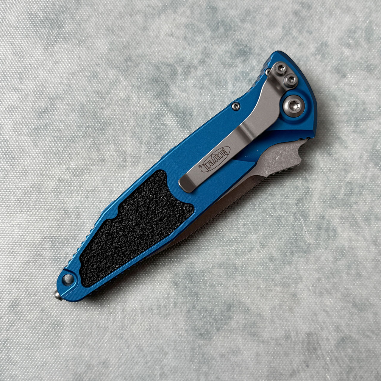 This model features a blue anodized 7075-T611 aluminum handle with grip inserts. Stonewash finished M390 stainless steel single edge clip point blade. Blasted hardware and pocket clip. The pocket clip is marked with the Microtech logo. The blade is marked with the Microtech logo, model information, production date, and serial number. Brand new in box.