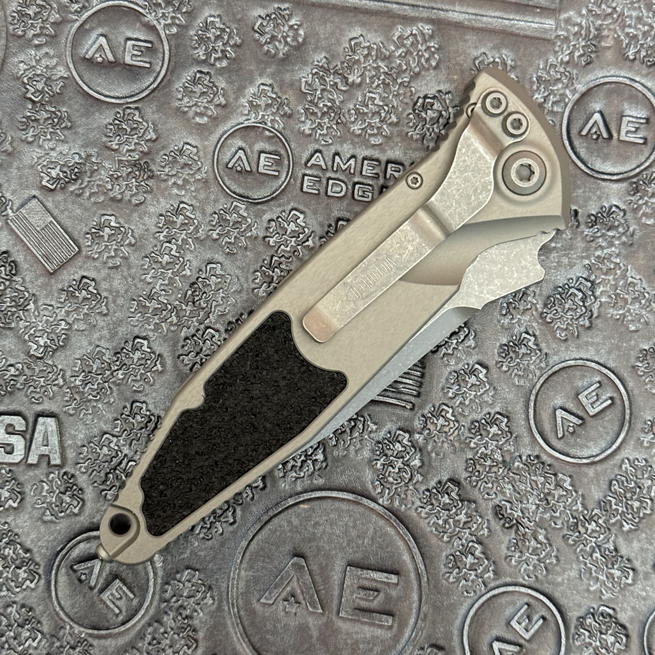 This model features a natural clear anodized 7075-T611 aluminum handle with grip inserts. Apocalyptic finished M390 stainless steel single edge clip point blade. Apocalyptic finished hardware and pocket clip. The pocket clip is marked with the Microtech logo. The blade is marked with the Microtech logo, model information, production date, and serial number. Brand new in box.