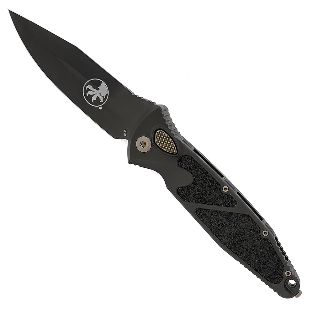 This limited edition signature series model features a black anodized 7075-T611 aluminum handle with grip inserts. Black DLC finished M390 stainless steel single edge spear point "Spike Grind" blade, the tip is sharped up the spine slightly for better piercing ability. Bronze finished hardware and pocket clip. The pocket clip is marked with the Microtech signature series logo, model information, production date, and serial number. The blade is marked with the Microtech Claw logo. Brand new in box.