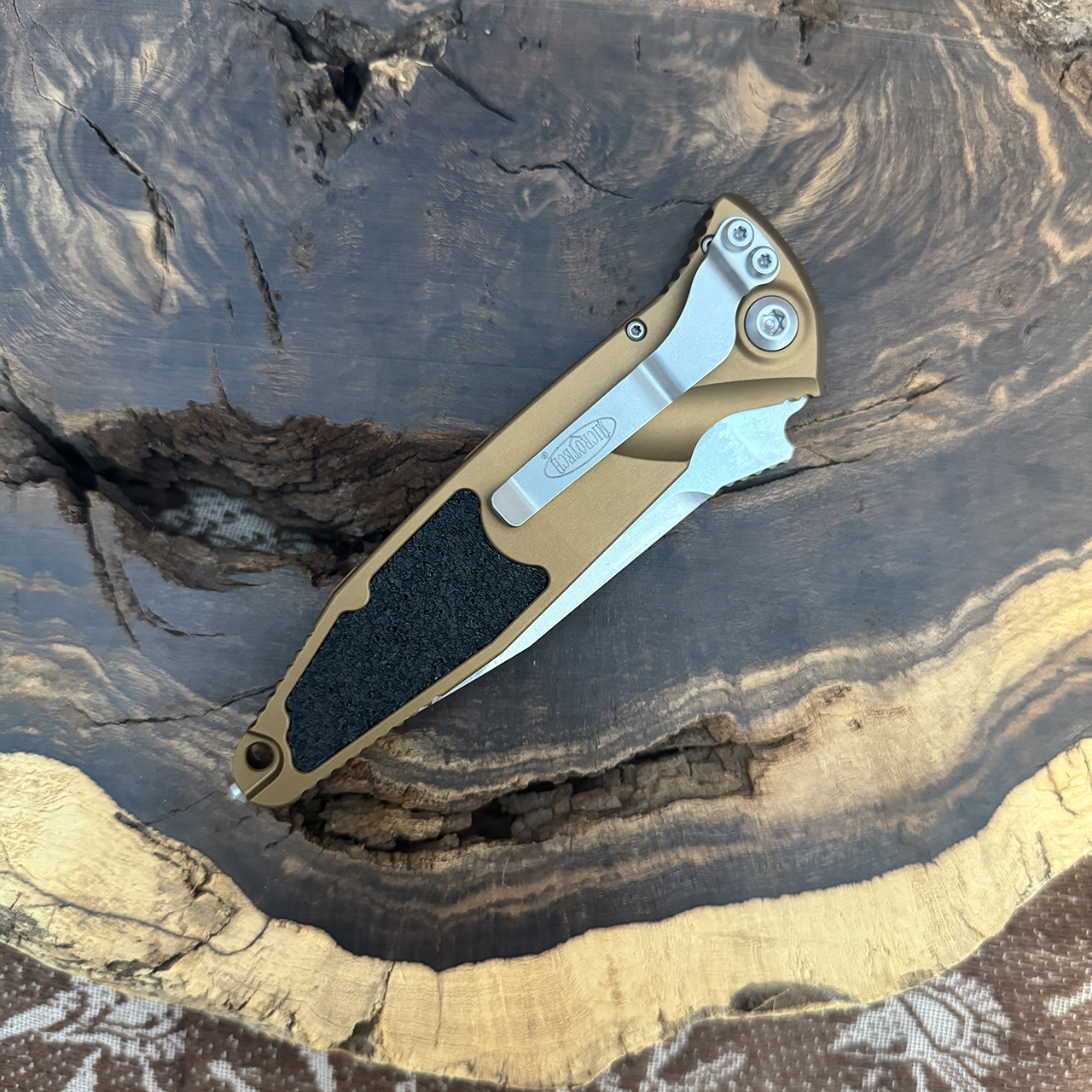 This model features a tan anodized 7075-T611 aluminum handle with grip inserts. Stonewash finished M390 stainless steel single edge clip point blade. Bead blasted hardware and pocket clip. The pocket clip is marked with the Microtech logo. The blade is marked with the Microtech logo, model information, production date, and serial number. Brand new in box.