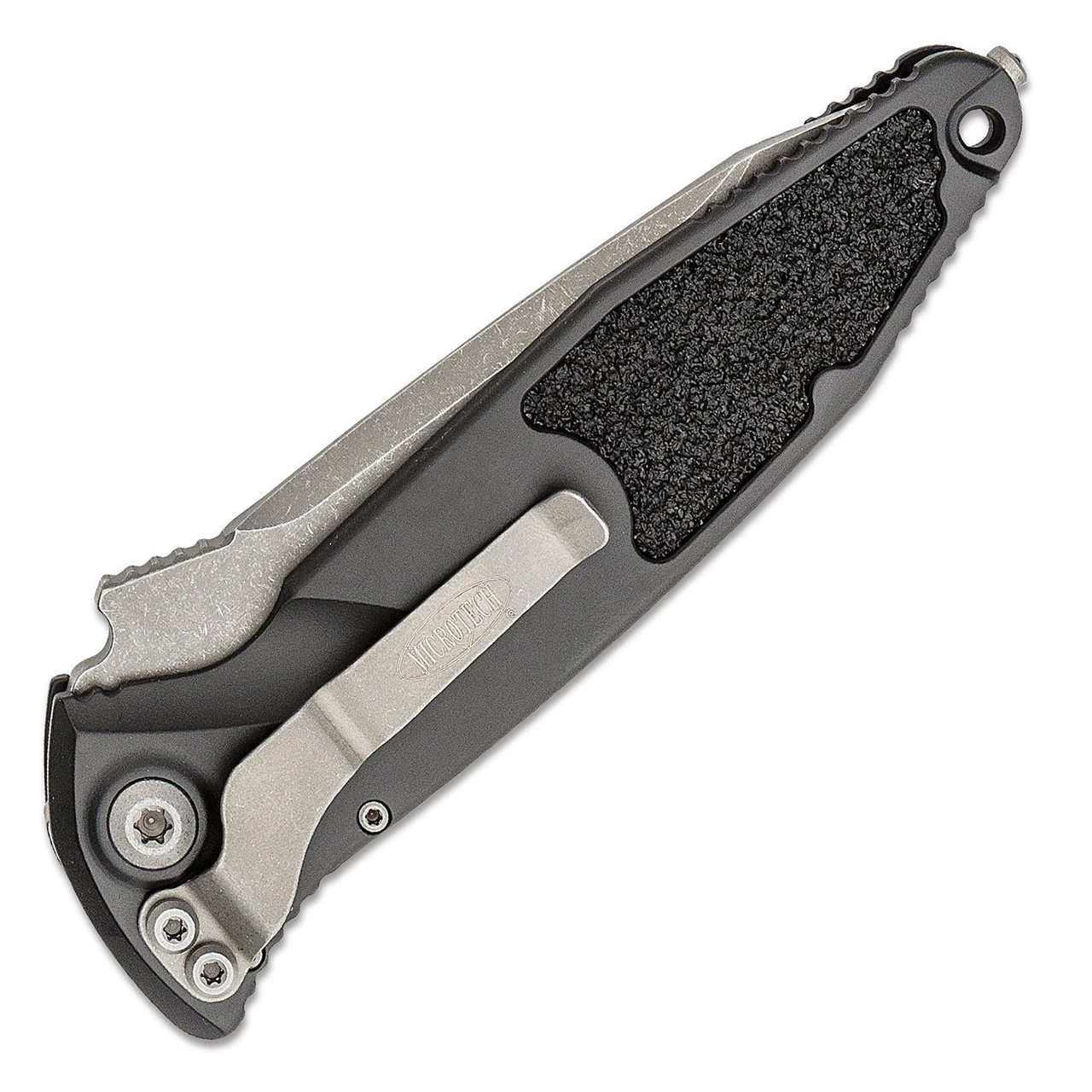 This model features a black aluminum handle with grip inserts. Apocalyptic finished M390 stainless steel tanto edge blade with a standard cutting edge. Apocalyptic hardware, glass breaker, and pocket clip. The pocket clip is marked with the Microtech logo. The blade is marked with the Microtech logo, model information, production date, and serial number. Brand new in box.