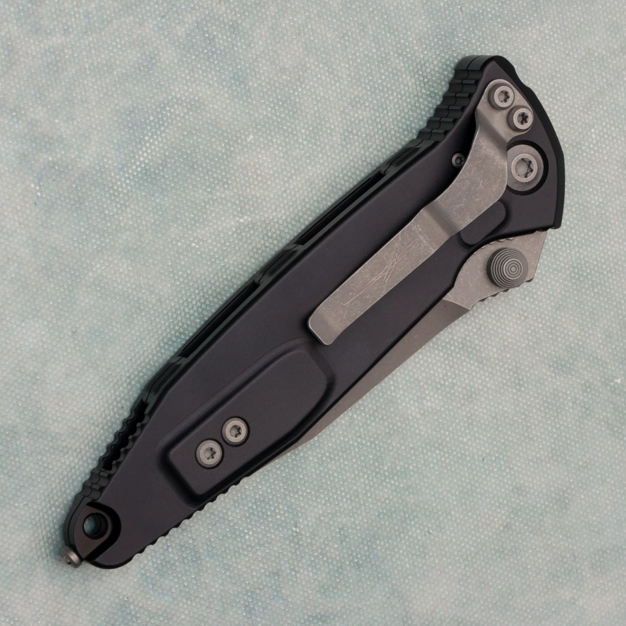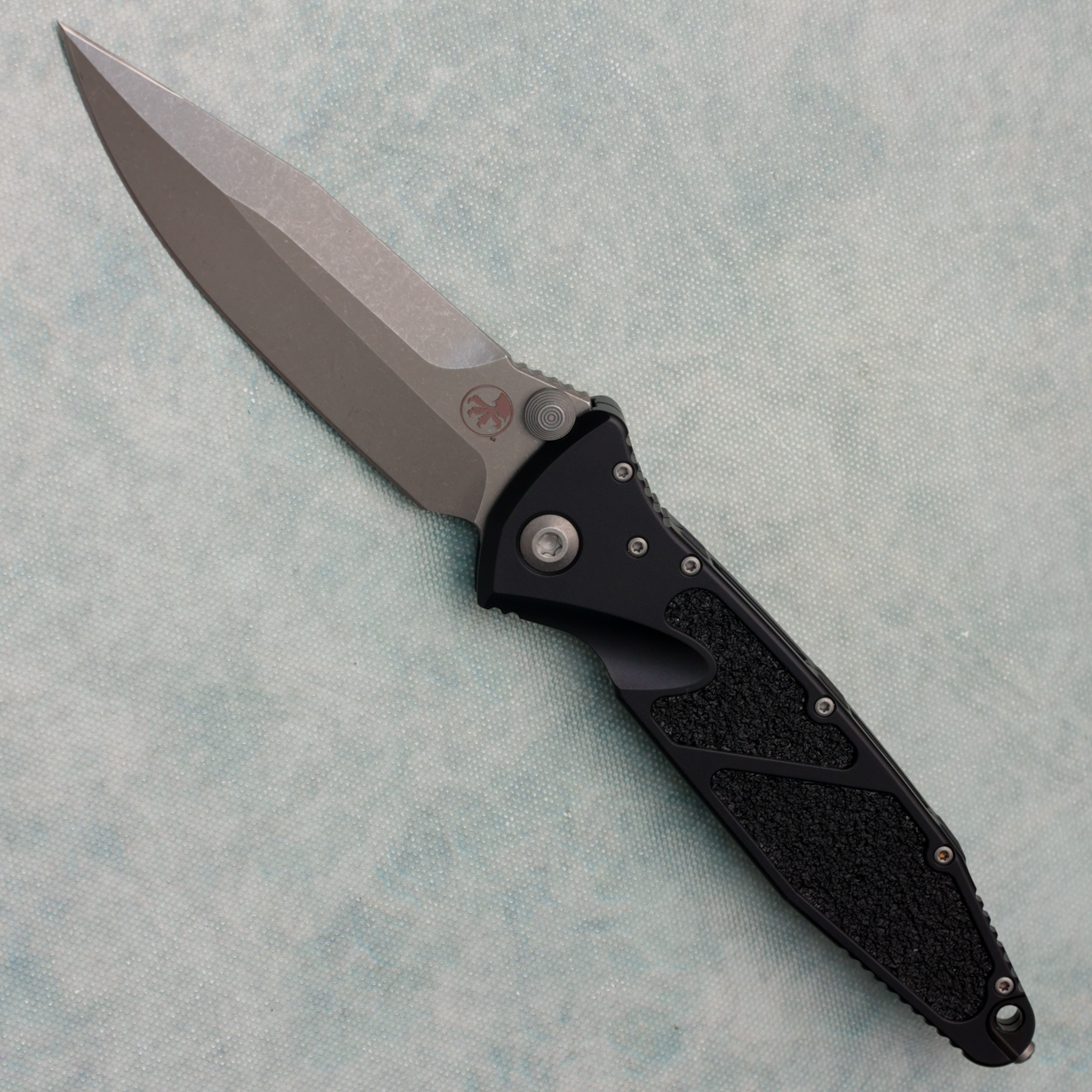 This model features a black anodized 7075-T611 aluminum handle with grip inserts. Apocalyptic finished M390 stainless steel spear point blade. Bead blasted hardware and apocalyptic finished pocket clip. The pocket clip is marked with the Microtech logo. The blade is marked with the Microtech logo. Brand new in box.