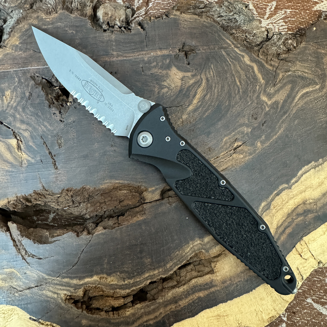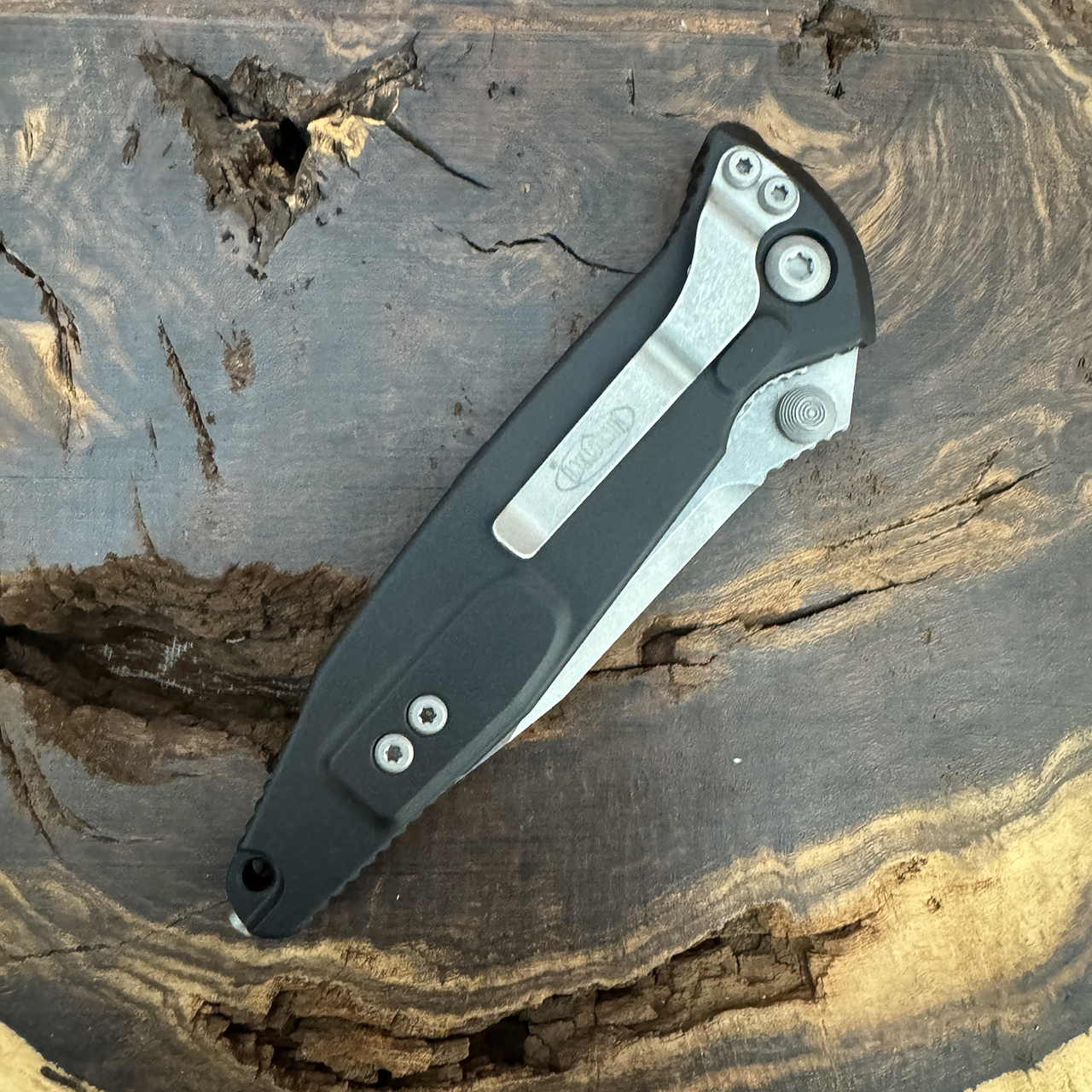 This model features a black anodized aluminum handle with grip inserts. Apocalyptic finished M390 stainless steel single edge clip point blade with partial serrated cutting edge. Apocalyptic finished hardware, glass breaker, and pocket clip. The pocket clip is marked with the Microtech logo. The blade is marked with the Microtech logo, model information, production date, and serial number. Brand new in box.