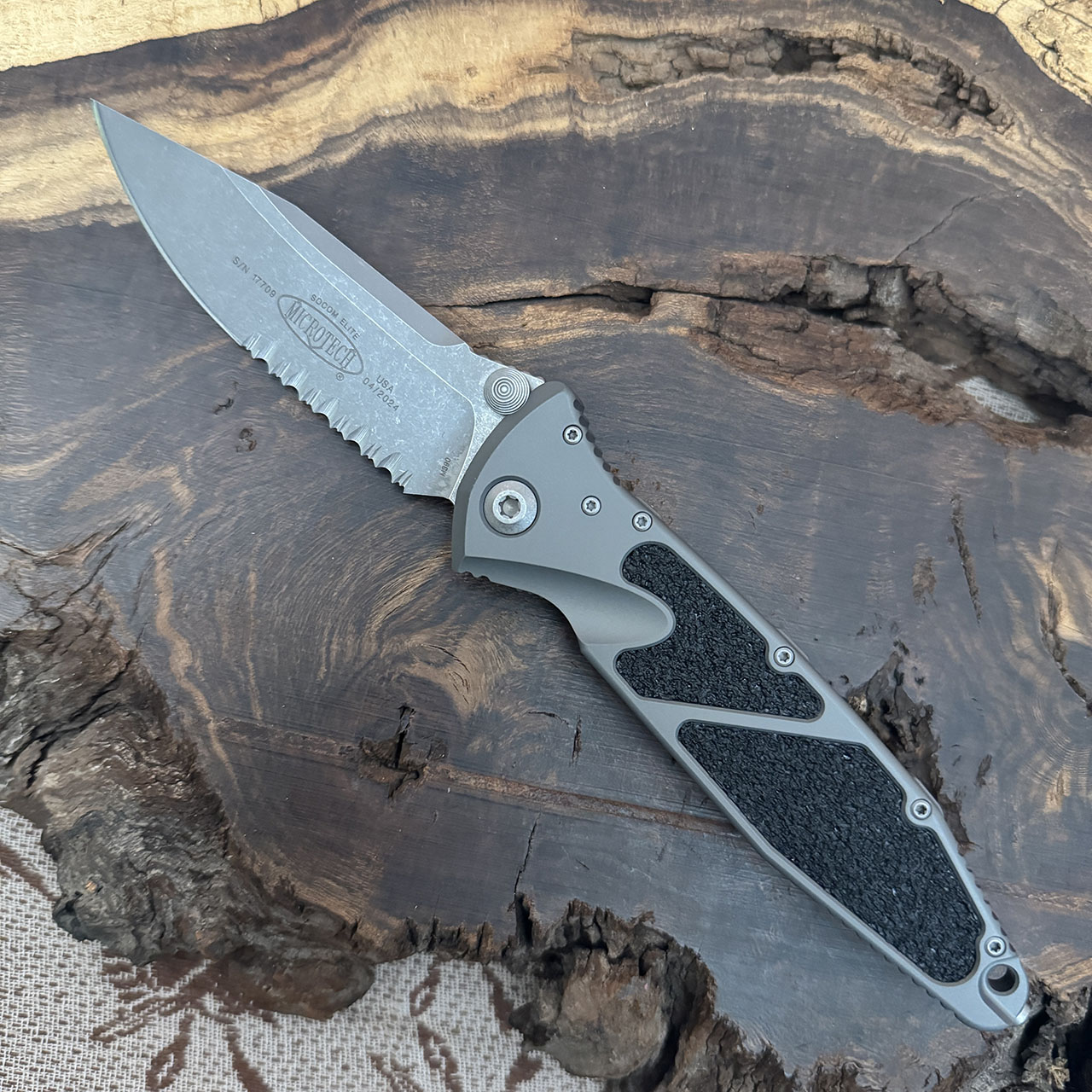 This model features a natural clear anodized aluminum handle with grip inserts. Apocalyptic finished M390 stainless steel single edge clip point blade with partial serrated cutting edge. Apocalyptic finished hardware, glass breaker, and pocket clip. The pocket clip is marked with the Microtech logo. The blade is marked with the Microtech logo, model information, production date, and serial number. Brand new in box.
