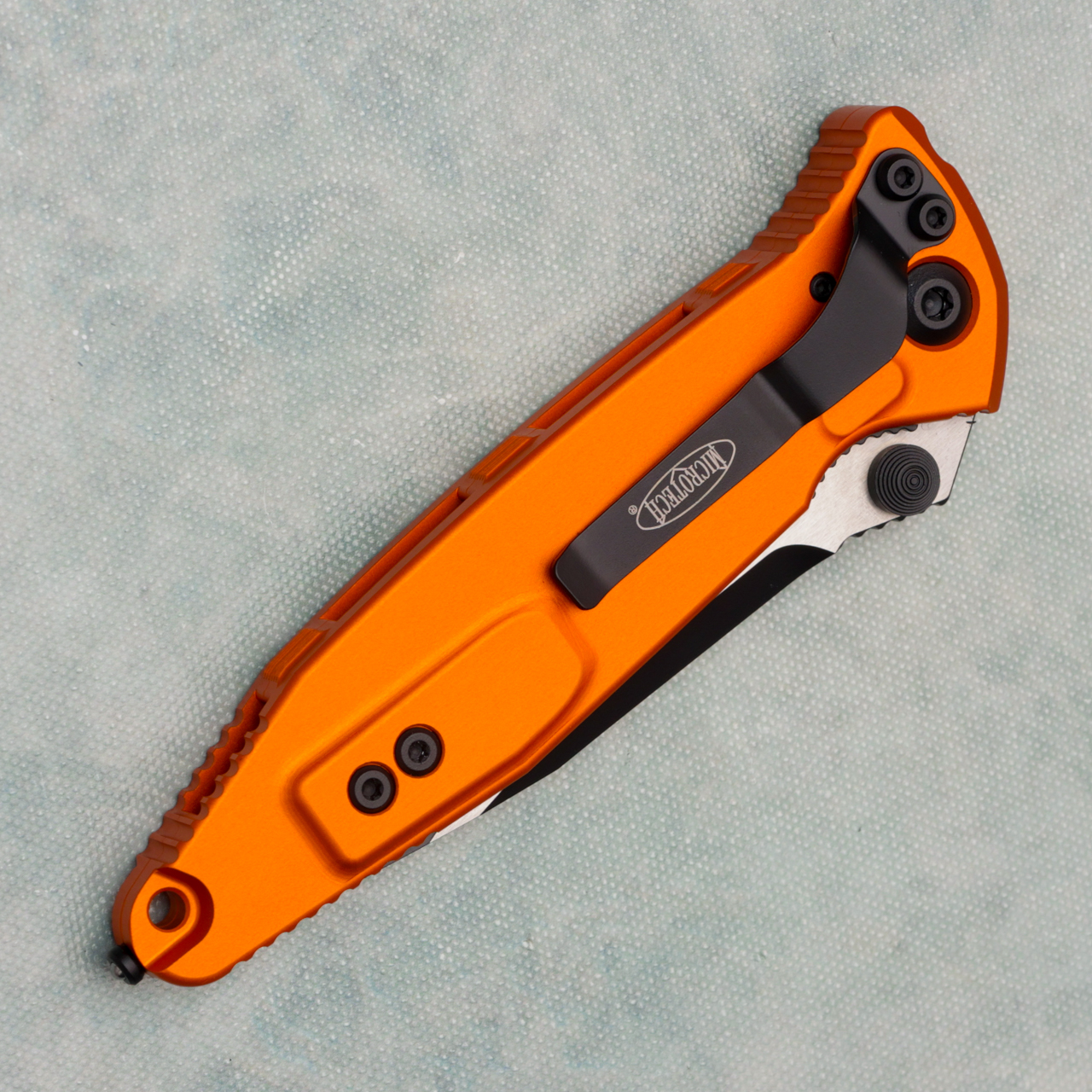 This model features a orange anodized 7075-T611 aluminum handle with grip inserts. Two tone black/satin finished M390 stainless steel single edge clip point blade. Black finished hardware, glass breaker, and pocket clip. The pocket clip is marked with the Microtech logo. The blade is marked with the Microtech logo, model information, production date, and serial number. Brand new in box.