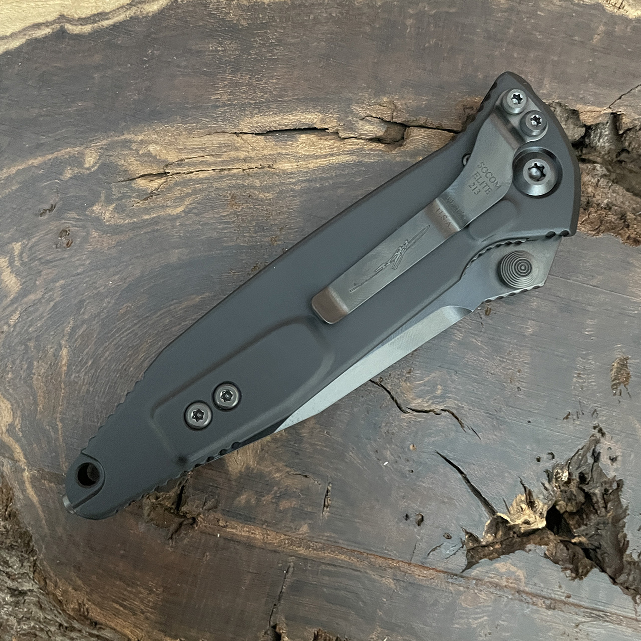 This shadow signature series model features a black anodized 7075-T611 aluminum handle with grip inserts. DLC finished M390 stainless steel single edge clip point blade. DLC finished hardware and pocket clip. The pocket clip is marked with the Microtech signature series logo, model information, production date, and serial number. The blade is sterile. Brand new in box.
