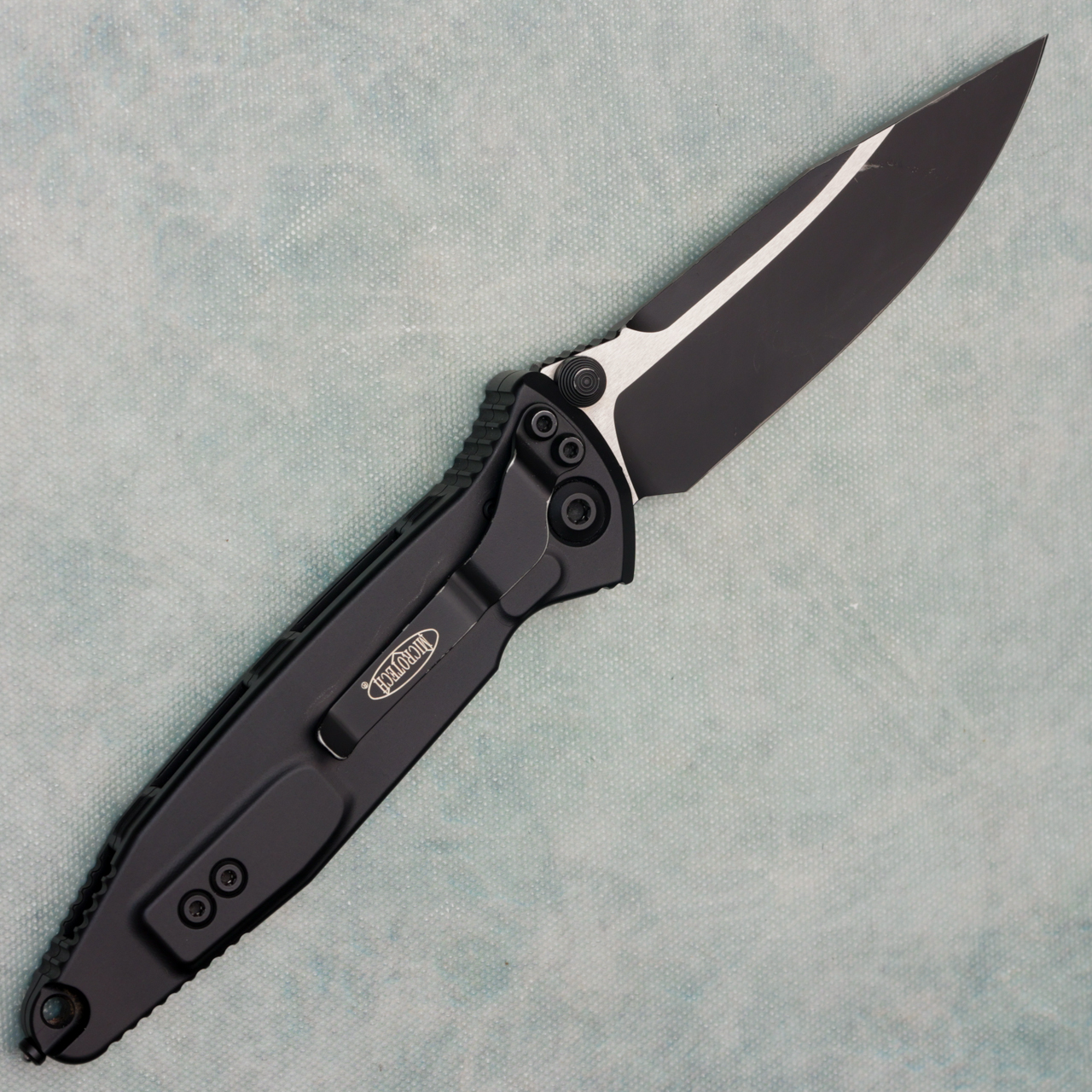 This model features a black anodized 7075-T611 aluminum handle with grip inserts. Two tone black/satin finished M390 stainless steel single edge clip point blade. Black finished hardware, glass breaker, and pocket clip. The pocket clip is marked with the Microtech logo. The blade is marked with the Microtech logo, model information, production date, and serial number. Some definate marks on blade. Pocket clip wear especially around edges, with box.