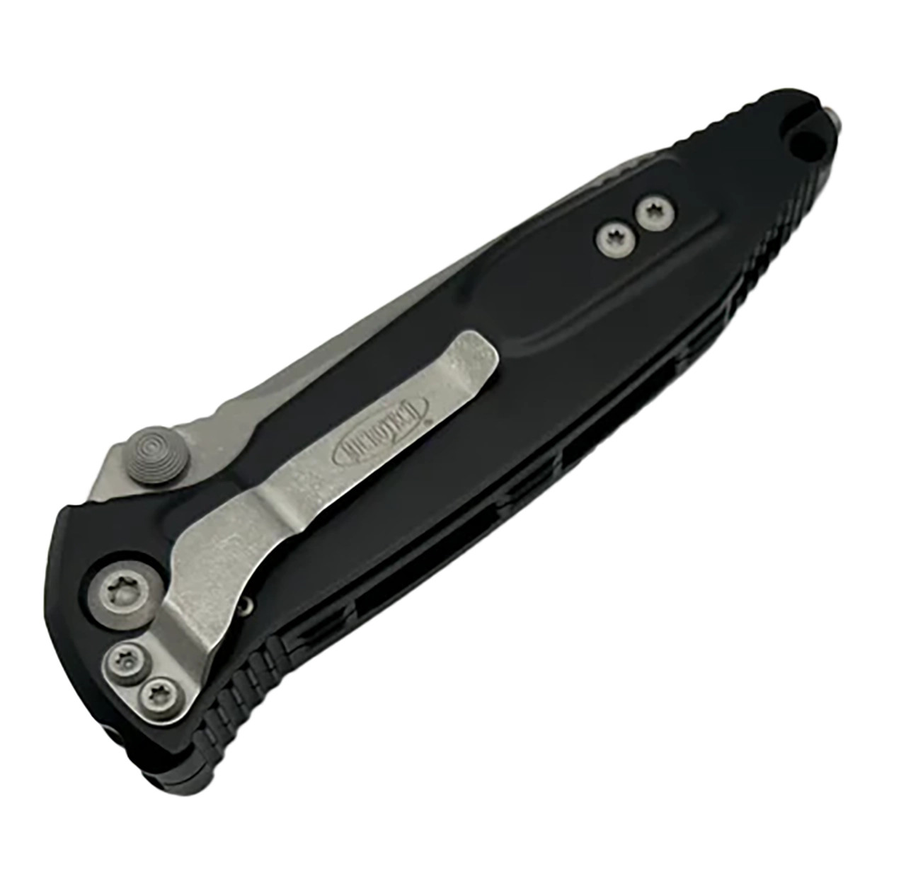 This model features a black anodized 7075-T611 aluminum handle with grip inserts. Apocalyptic finished M390 stainless steel tanto blade with a partially serrated edge. Bead Blast finished hardware and pocket clip. The pocket clip is marked with the Microtech logo. The blade is marked with the Microtech logo, model information, production date, and serial number. Brand new in box.