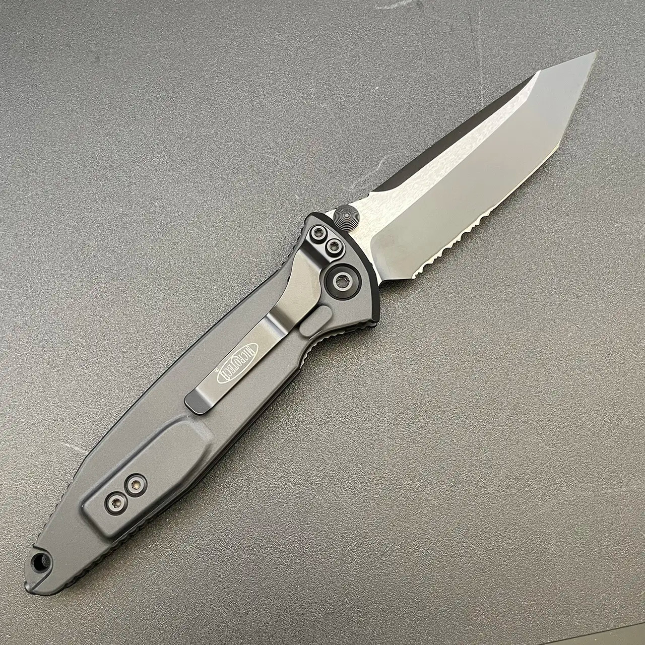 This model features a black anodized 7075-T611 aluminum handle with grip inserts. Black finished M390 stainless steel tanto blade with a partial serrated edge. Black tactical finished hardware and pocket clip. The pocket clip is marked with the Microtech logo. The blade is marked with the Microtech logo, model information, production date, and serial number. Brand new in box.