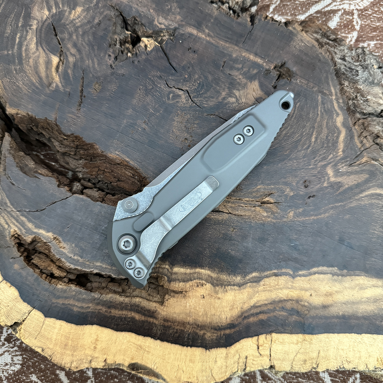 This model features a natural clear aluminum handle with grip inserts. Apocalyptic finished M390 stainless steel single edge tanto blade. Apocalyptic finished hardware and pocket clip. The pocket clip is marked with the Microtech logo. The blade is marked with the Microtech logo, model information, production date, and serial number. Brand new in box.