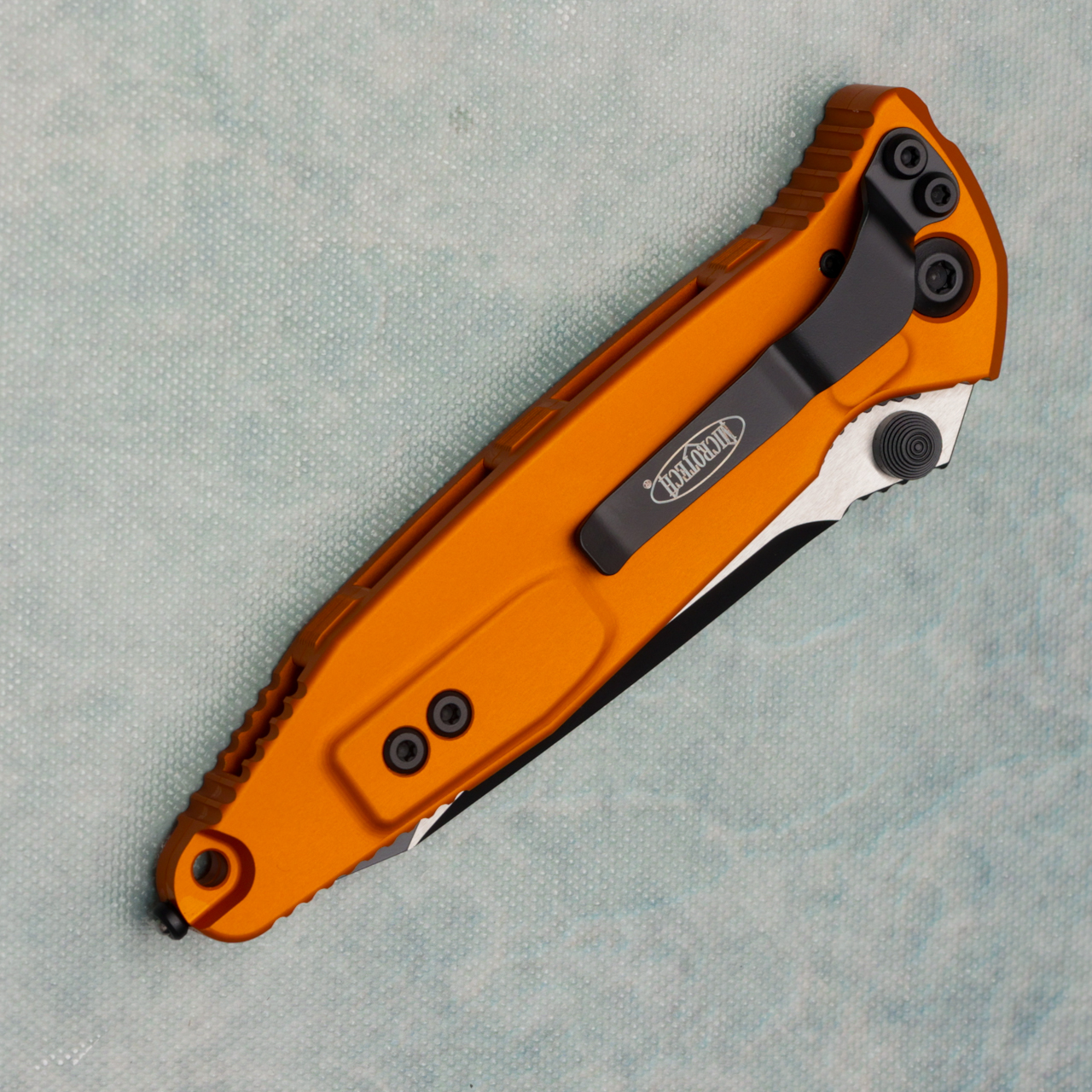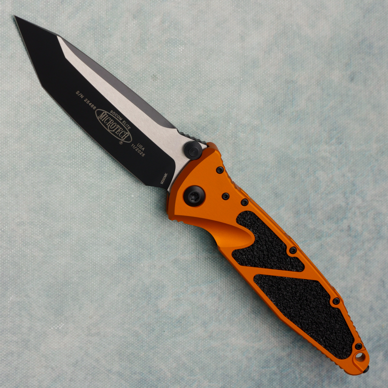 This model features a orange tangerine anodized 7075-T611 aluminum handle with grip inserts. Black finished M390 stainless steel tanto blade with a standard edge. Black finished hardware and pocket clip. The pocket clip is marked with the Microtech logo. The blade is marked with the Microtech logo, model information, production date, and serial number. Brand new in box.