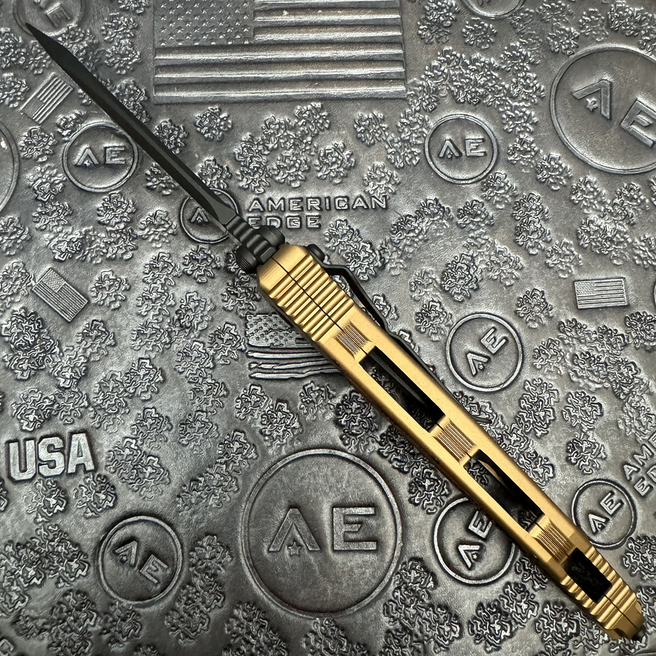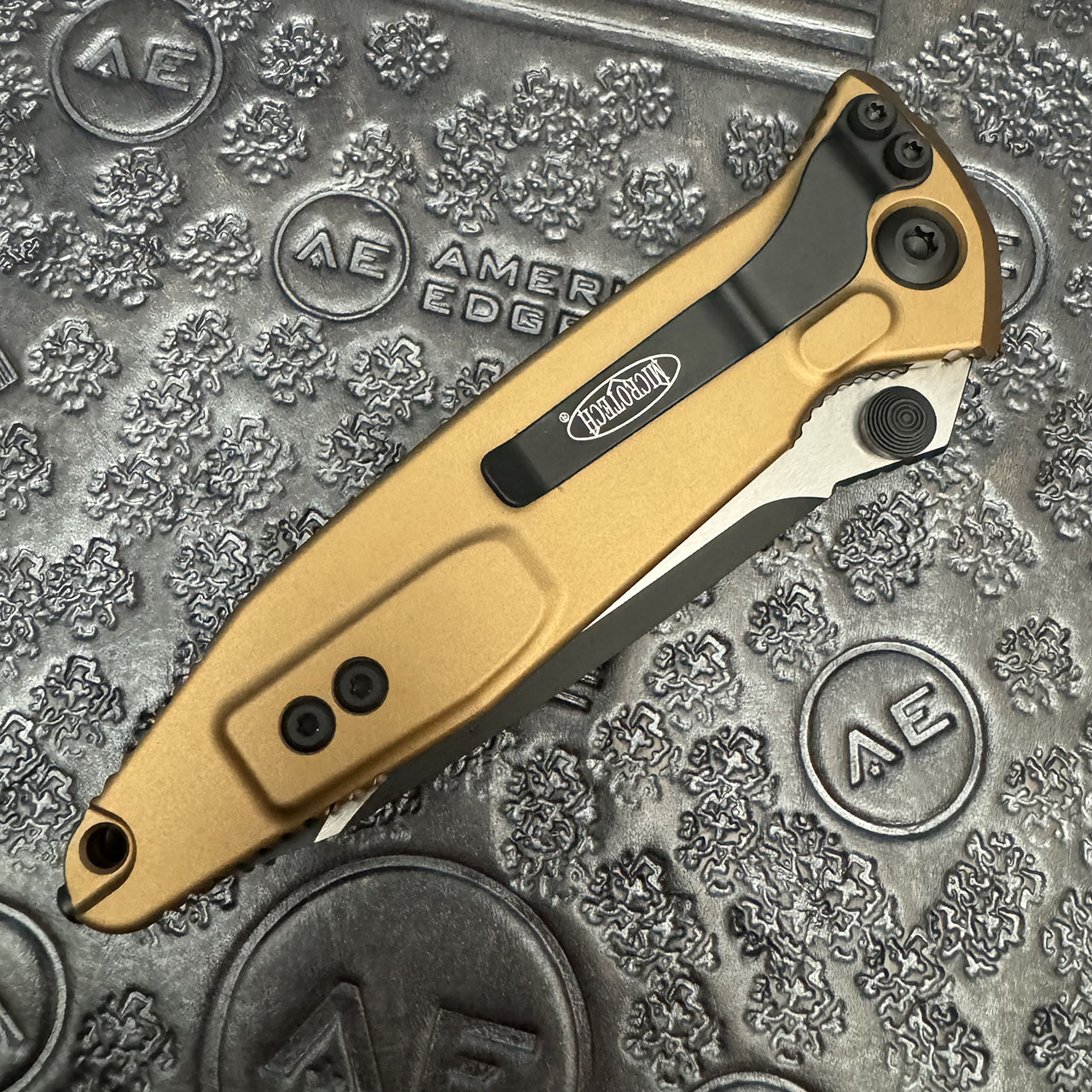This model features tan anodized aluminum handles with grip inserts. Black finished M390 stainless steel single edge tanto blade with partial serrated cutting edge. Black finished hardware, glass breaker, and pocket clip. The pocket clip is marked with the Microtech logo. The blade is marked with the Microtech logo, model information, production date, and serial number. Brand new in box.