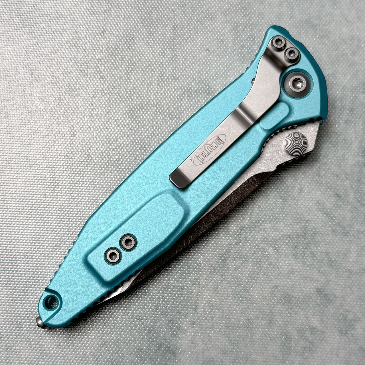 This model features a turquoise aluminum handle with grip inserts. Stonewash finished M390 stainless steel single edge tanto blade. Bead blast finished hardware and pocket clip. The pocket clip is marked with the Microtech logo. The blade is marked with the Microtech logo, model information, production date, and serial number. Brand new in box.