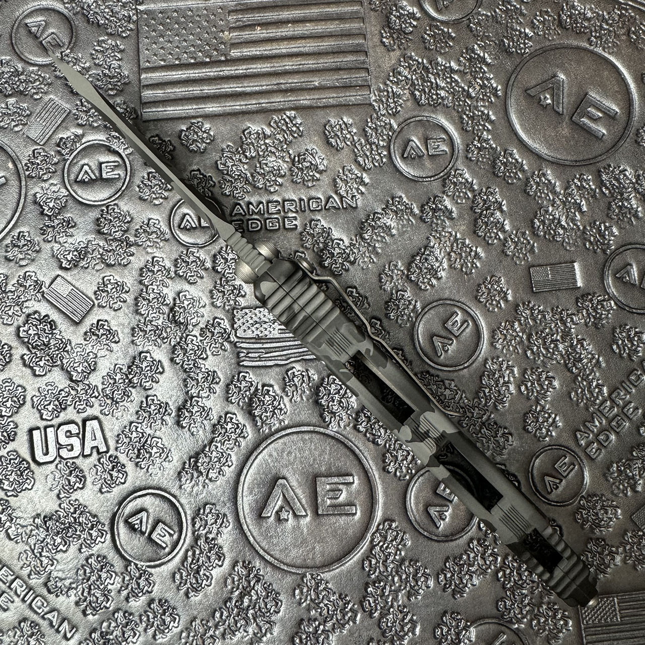 This Signature Series model features an Urban Camo finished aluminum handle with grip inserts. Two tone urban camo Cerakote/satin finished M390 stainless steel tanto edge blade. Bead Blasted finished hardware, glass breaker, and pocket clip. The pocket clip is marked with the Signature Series logo, model information, production date, and serial number. Brand new in box.