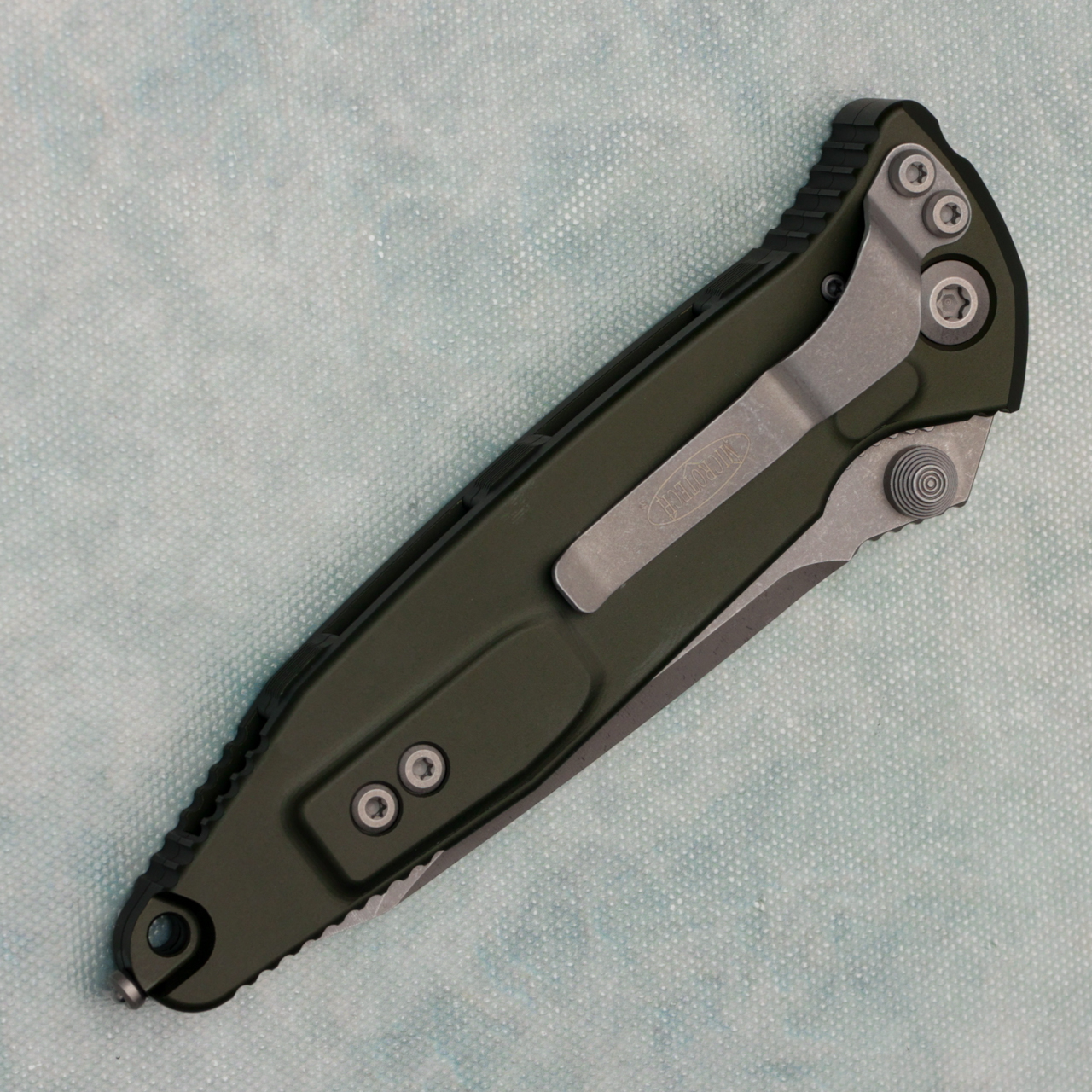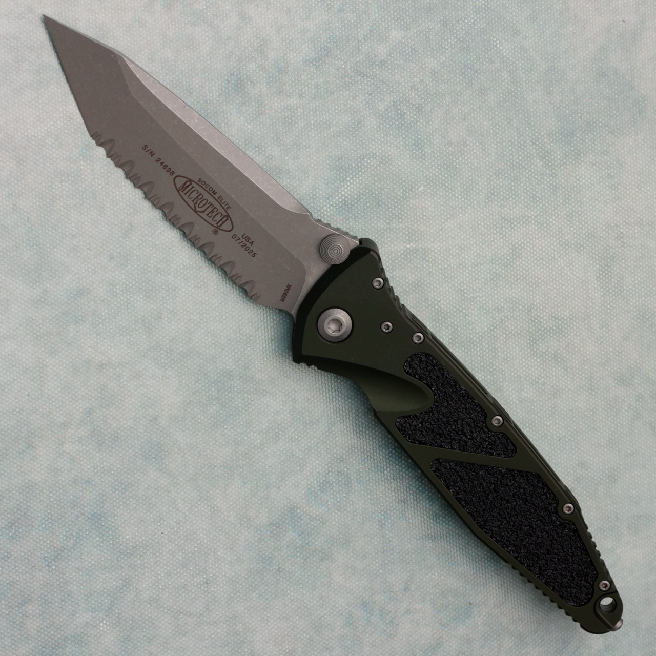 This model features a woodlands green 7075-T611 aluminum handle with grip inserts. Apolcayptic finished M390 stainless steel tanto blade with a fully serrated edge. Apoclayptic finished hardware and pocket clip. The pocket clip is marked with the Microtech logo. The blade is marked with the Microtech logo, model information, production date, and serial number. Brand new in box.