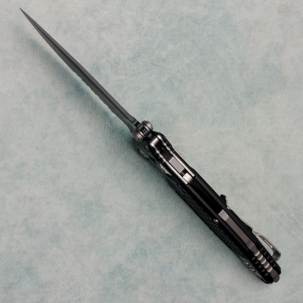 This model features a frag aluminum handle. Black M390MK stainless steel single edge part serrated clip point blade. New in box.
