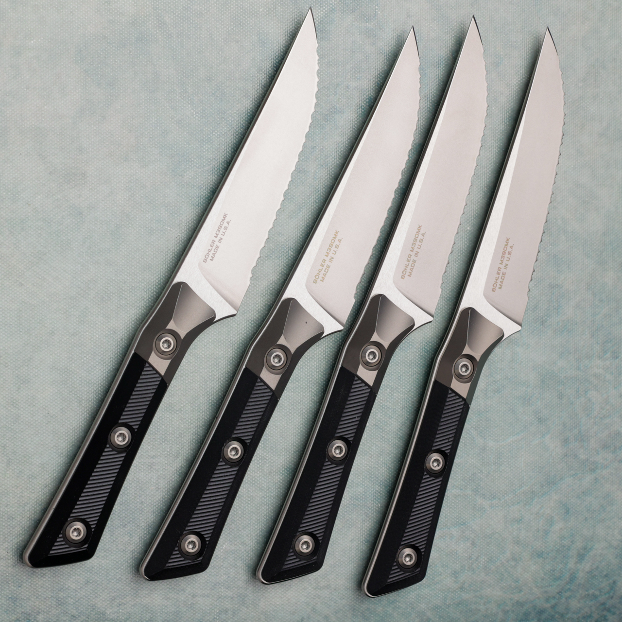 This set of 4 steak knives have black g-10 handle scales with bead blast titanium bolsters. Stonewash finished M390MK stainless steel blades. Brand new in box.