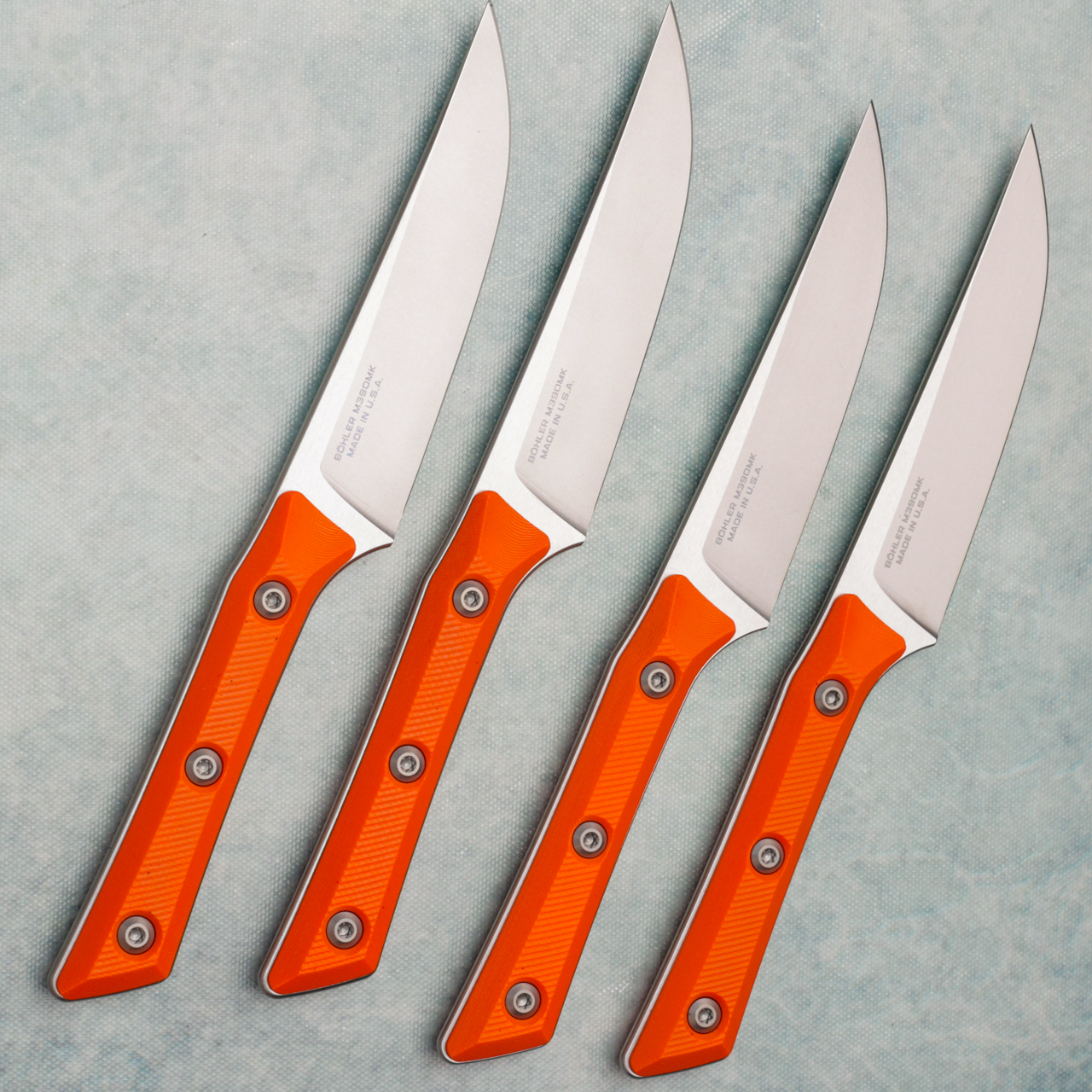This set of 4 steak knives have ember g-10 handle scales. Stonewash finished M390MK stainless steel blades. Brand new in box.