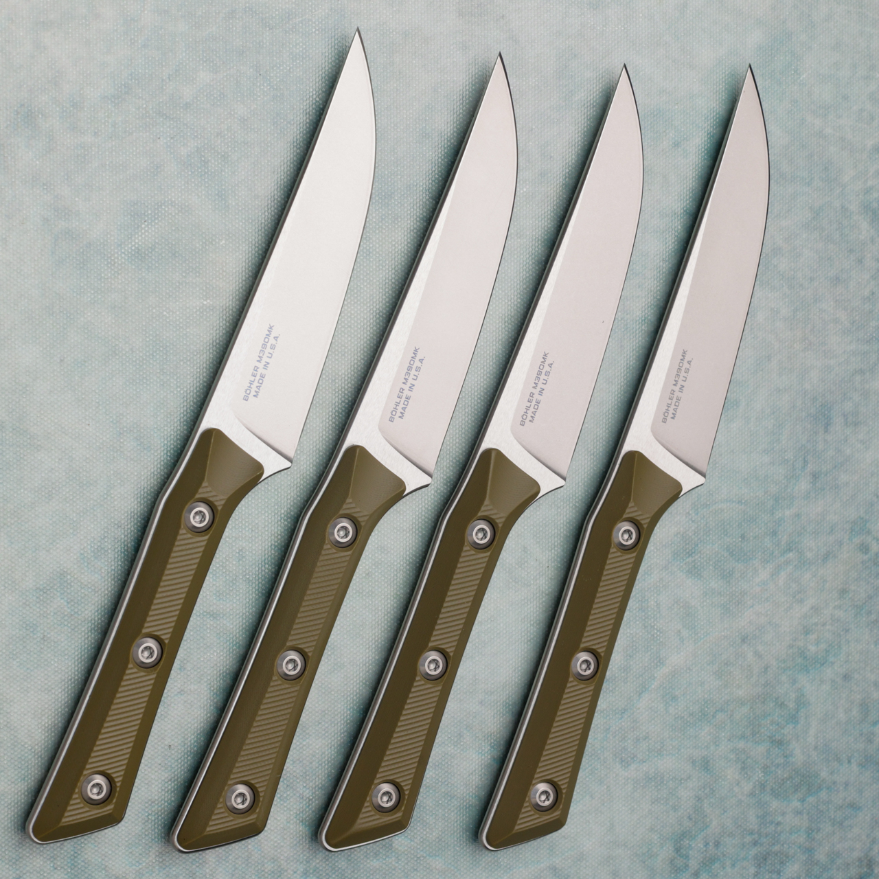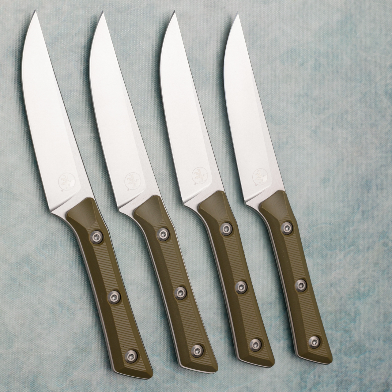 This set of 4 steak knives have od green g-10 handle scales. Stonewash finished M390MK stainless steel blades. Brand new in box.