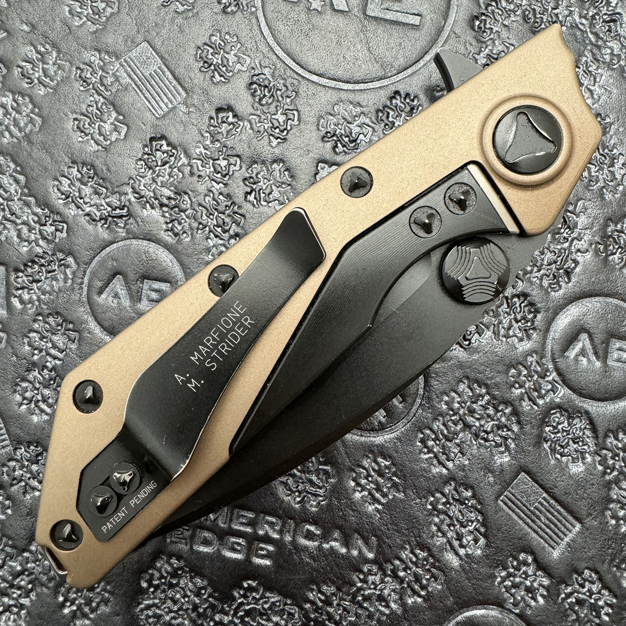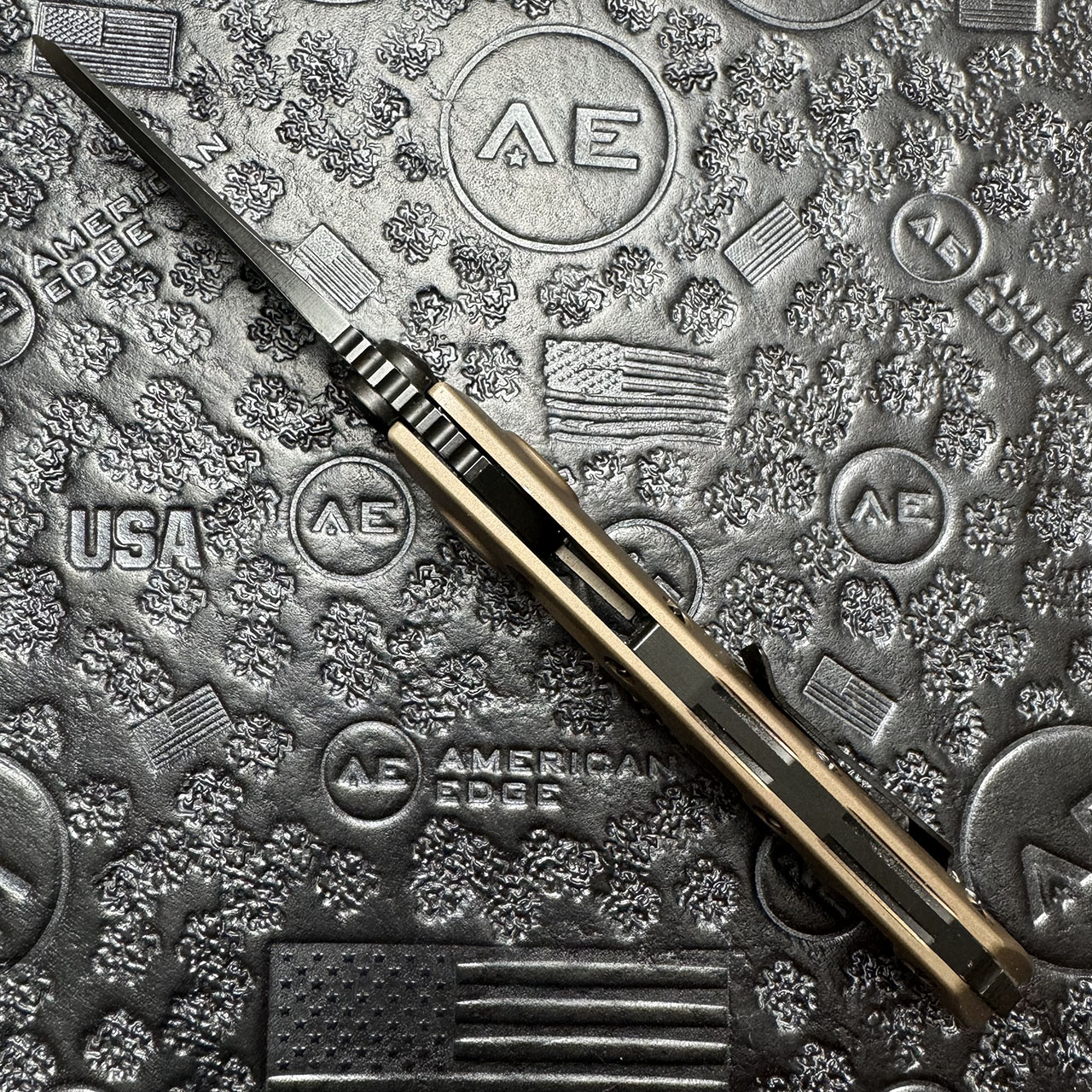 This model features a tan anodized 6061-T6 aluminum handle. Black finished ELMAX stainless steel blade with a standard edge. The hardware and pocket clip are black finished. Some light marks on edges of clip, and screws. Otherwise in very good pre-owned condition with box.
