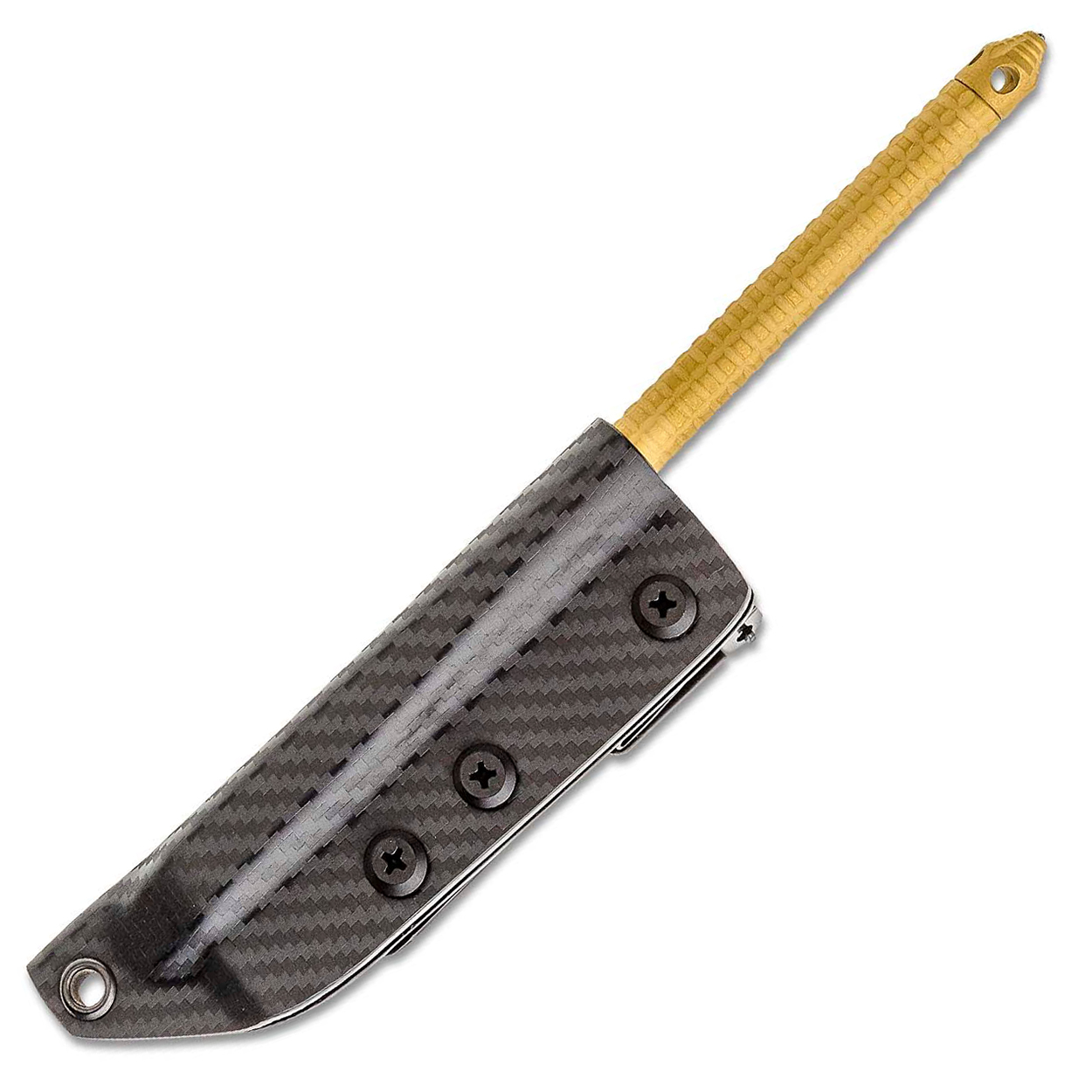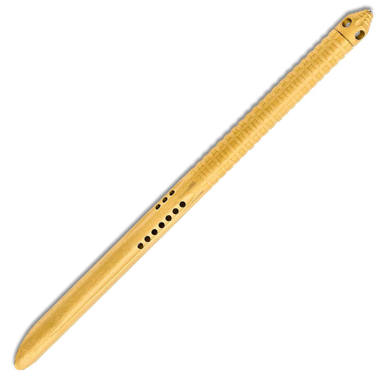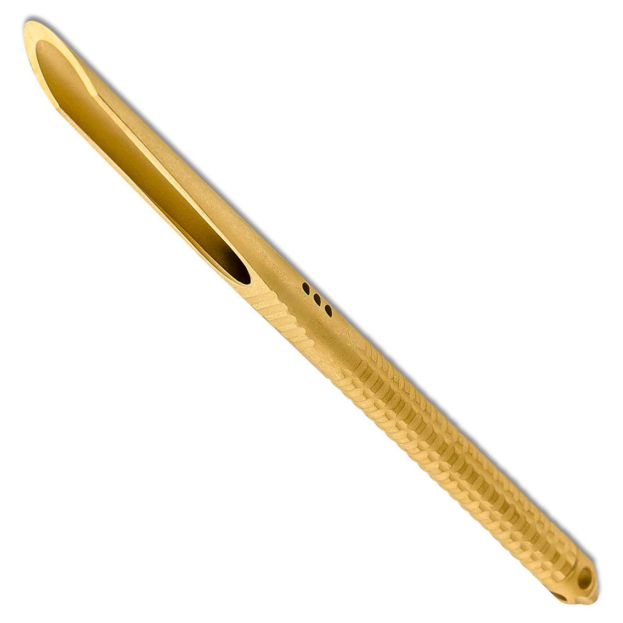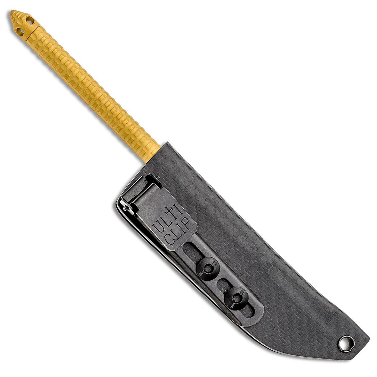 The all-new TAC-P is Microtech’s vision of a last ditch effort self-defense tool. The kubaton style design profile is made with ultra reliable 410 stainless steel featuring a hollow frag patterned handle with a removable threaded end cap. The TAC-P is equipped with Microtech's proprietary glass breaker, carbon fiber wrapped Kydex sheath, and an Ulti Clip, the most versatile holster clip on the market. Diversify your arsenal with the Tac-P. This limited edition signature series model features an all gold Ti Nitride coated finish. The inside is etched with the Signature series logo, model information, production date, and serial number. Brand new in box.
