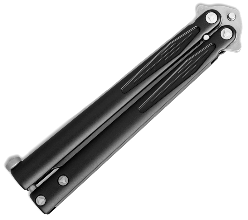 Unlike the hypothetical faster-than-light Tachyon particle, the Tachyon Balisong from Microtech is factual, proven and a reality. The production Microtech Tachyon III, features channel constructed handles milled from a single-piece of aluminum, a spring latch, and a standard pocket clip. The blade shows off more milling, which houses the Microtech logo and model information. The clip point bowie blade has an unsharpened bayonet style swedge.