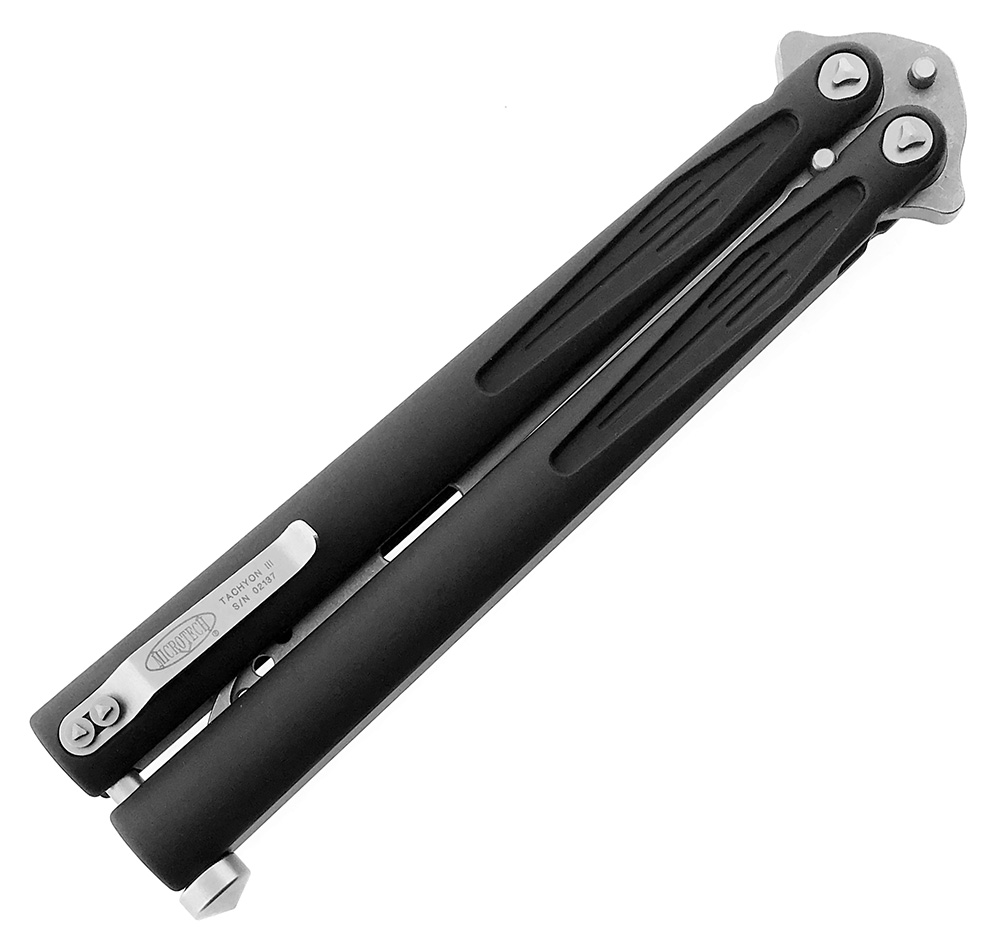 Unlike the hypothetical faster-than-light Tachyon particle, the Tachyon Balisong from Microtech is factual, proven and a reality. The production Microtech Tachyon III, features channel constructed handles milled from a single-piece of aluminum, a spring latch, and a standard pocket clip. The blade shows off more milling, which houses the Microtech logo and model information. The clip point bowie blade has an unsharpened bayonet style swedge.